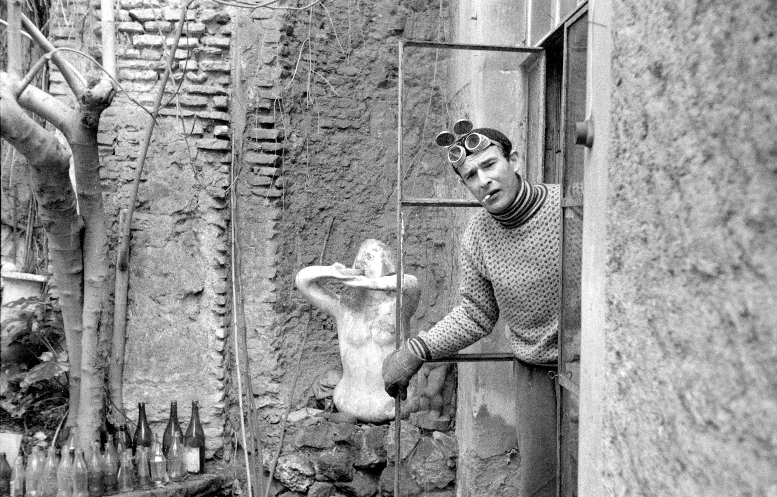 Black and white photograph of a young man in a patterned turtleneck and goggles on his forehead, leaning from a metal doorway beside a rough plaster sculpture of a torso outdoors