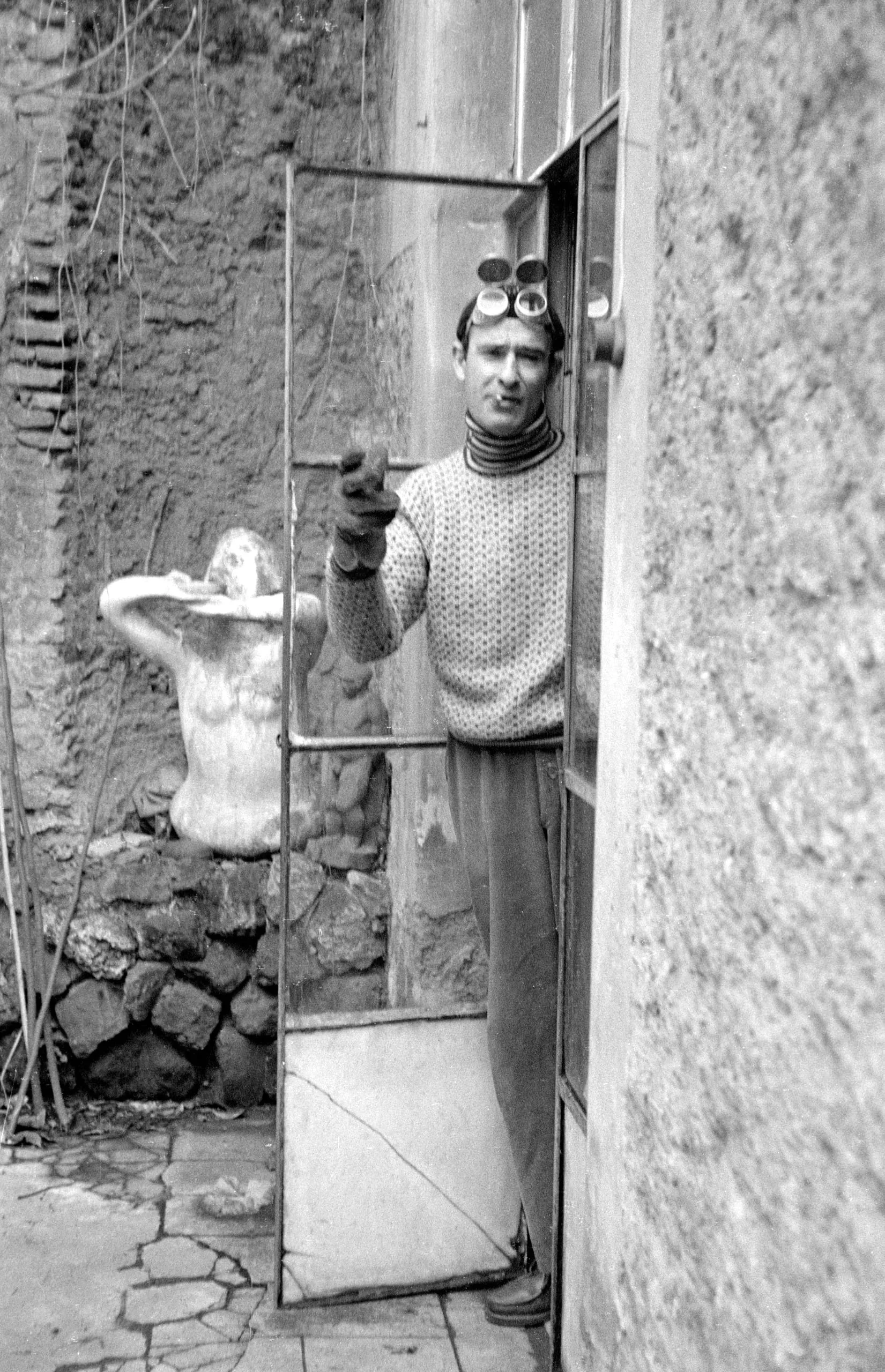Black and white photograph of a man in a knit turtleneck reaching toward the camera through an open glass door, with a female torso sculpture visible in the courtyard behind him