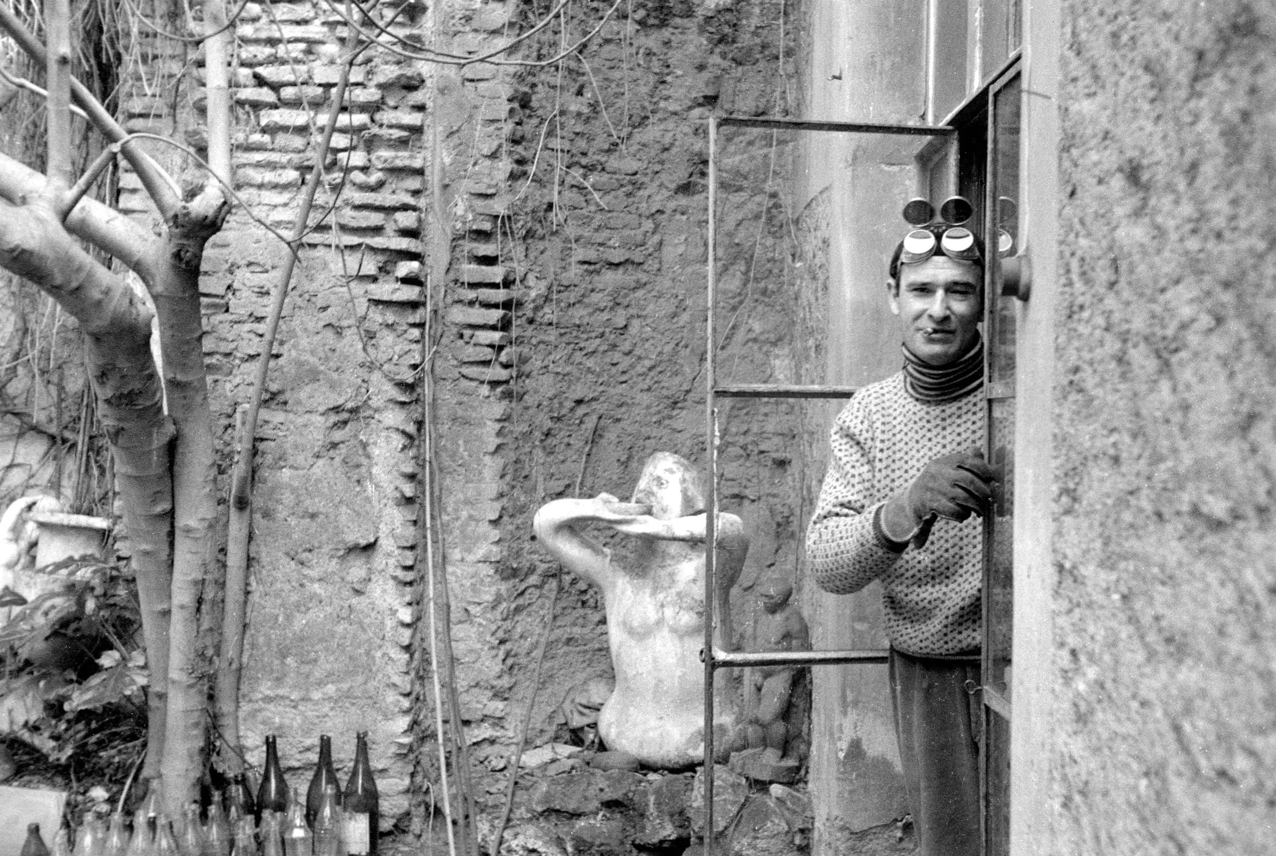 Black and white photograph of a man in a knit sweater with goggles on his forehead leaning from a metal doorway, with a partial figurative sculpture and crumbling brick wall behind him