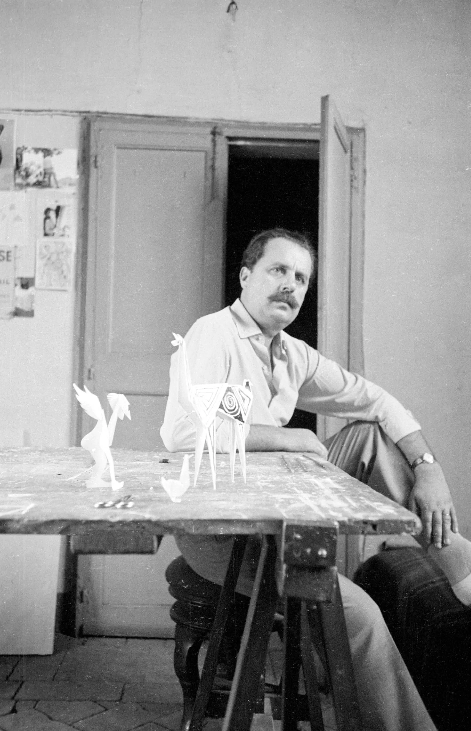 Black and white photograph of a mustachioed man seated at a paint-worn worktable with small white sculptural maquettes, looking upward in an artist's studio
