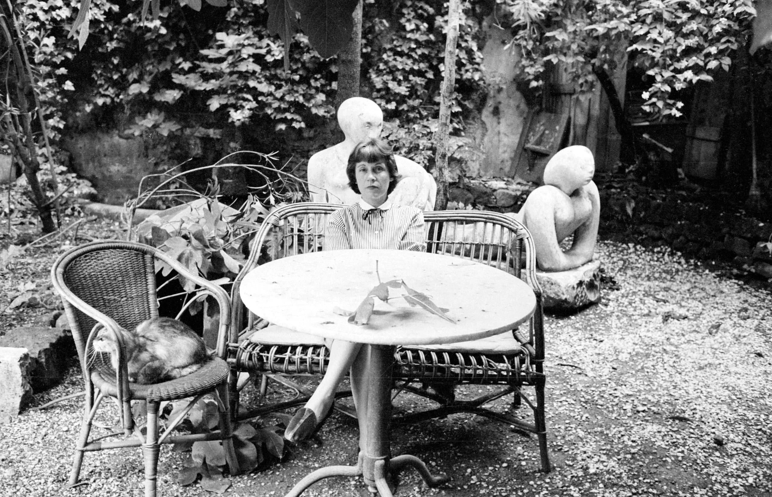 Black and white photograph of a woman seated on a wicker loveseat in a garden, with a sleeping cat on a nearby chair and stone sculptures behind her