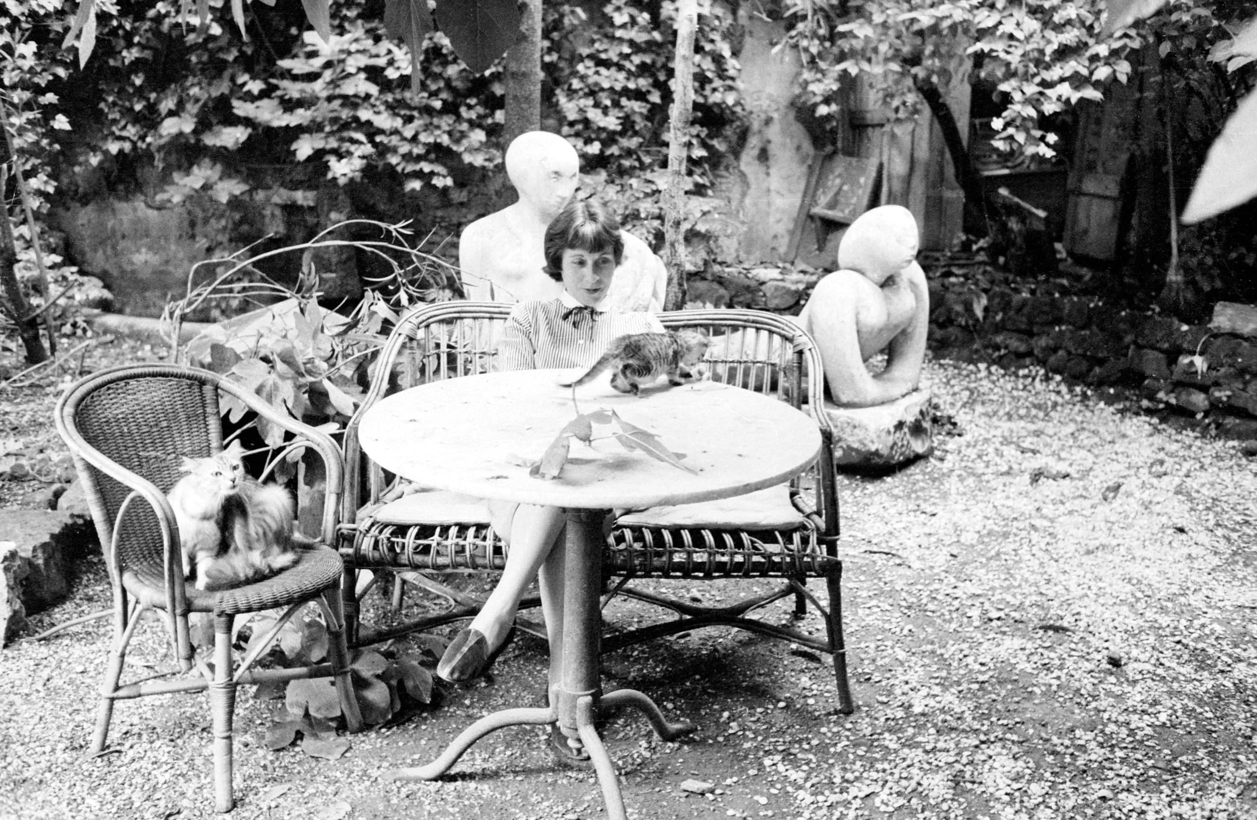 Black and white photograph of a young woman seated at a round wicker table outdoors, a cat on the table before her, with pale sculptural figures and dense foliage behind