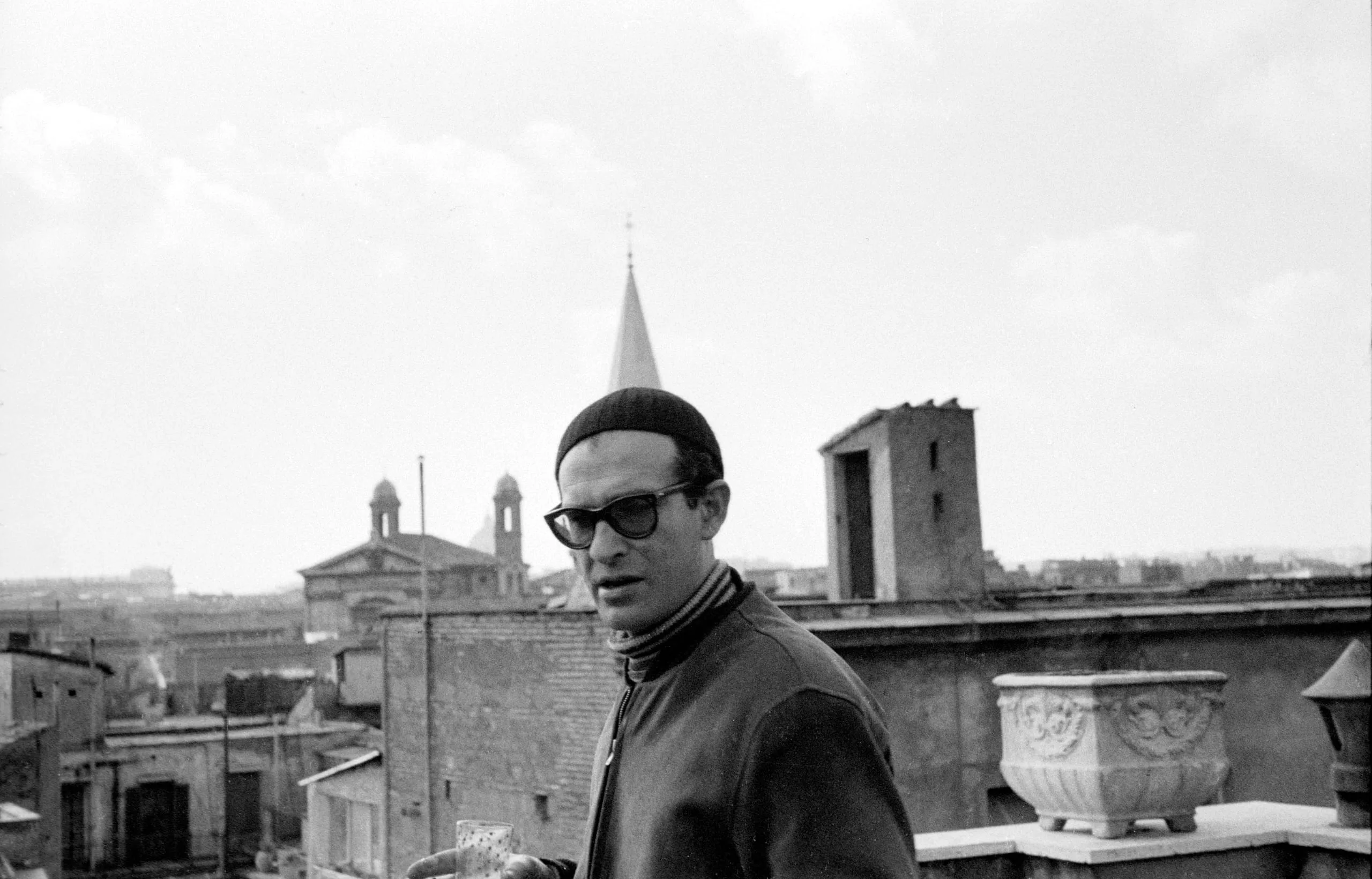Black and white photograph of a man in sunglasses and a dark knit cap on a rooftop terrace, holding a small glass, with a church steeple and city rooftops behind him