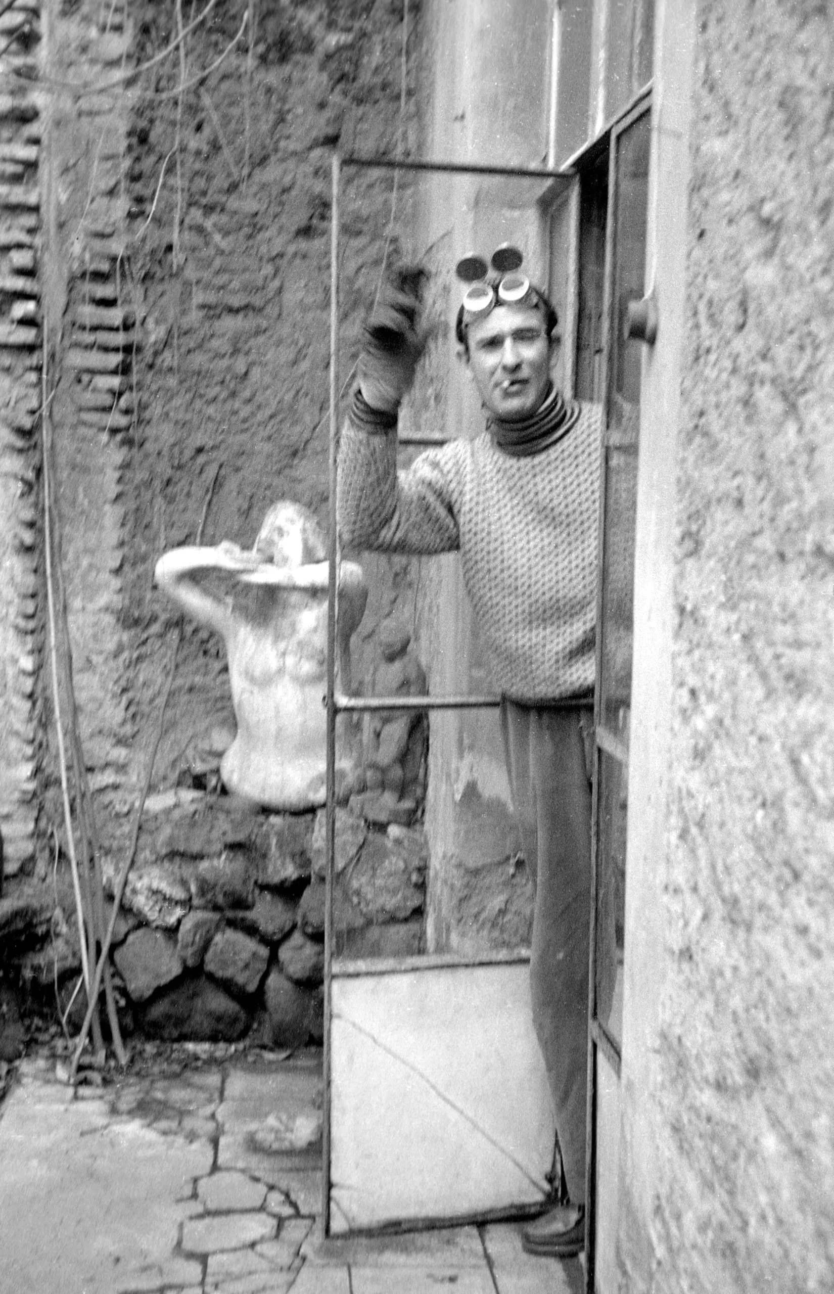Black and white photograph of a man in a turtleneck sweater standing in an open glass door, goggles pushed up on his forehead, with a pale female torso sculpture visible behind him in a stone courtyard