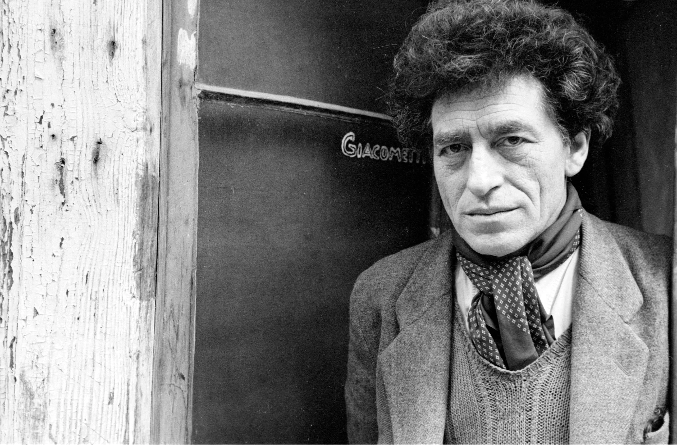 Black and white photograph, man from the chest up leaning in a doorframe, wearing a blazer and loosely knotted scarf, the word 'Giacometti' written on the dark surface behind him
