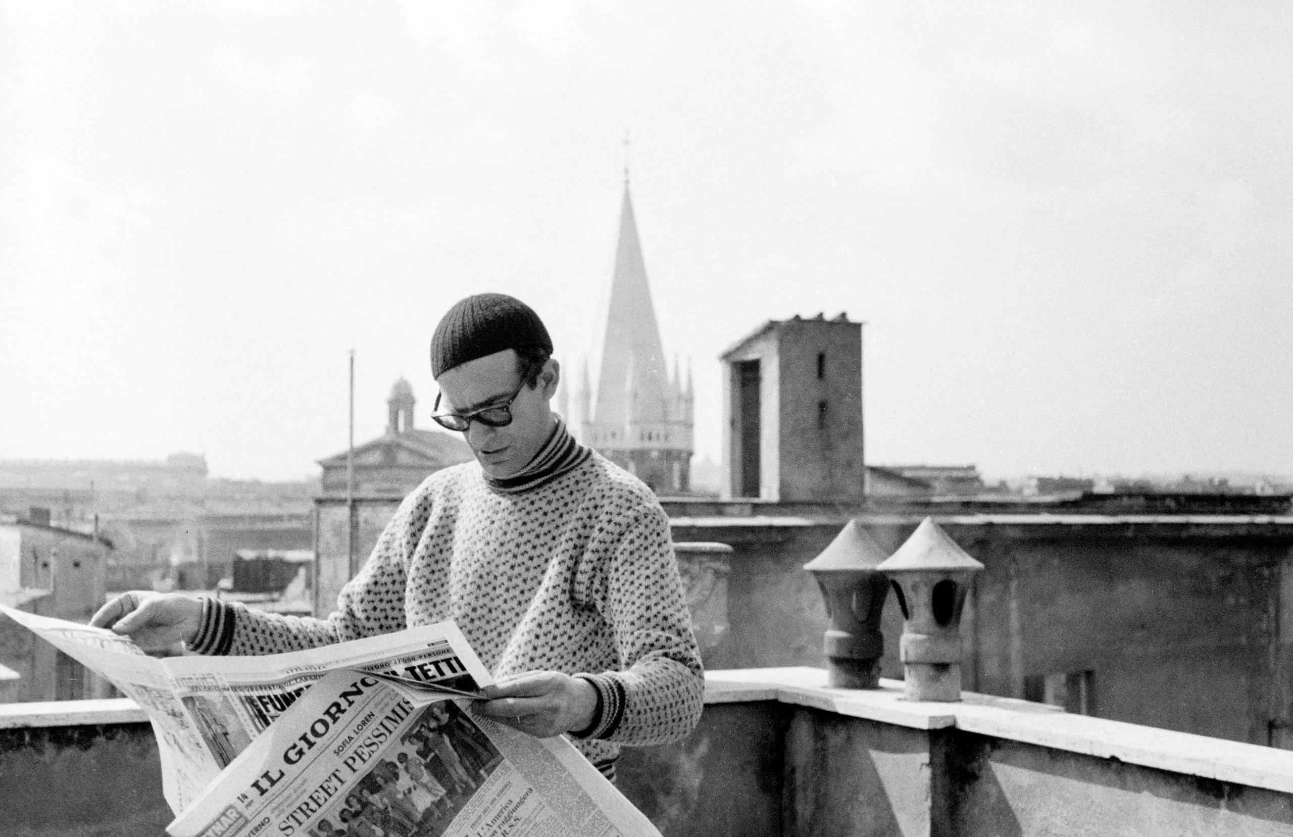 Black and white photograph of a man in glasses and a knit beanie reading an Italian newspaper on a rooftop, with a Gothic church spire visible in the background
