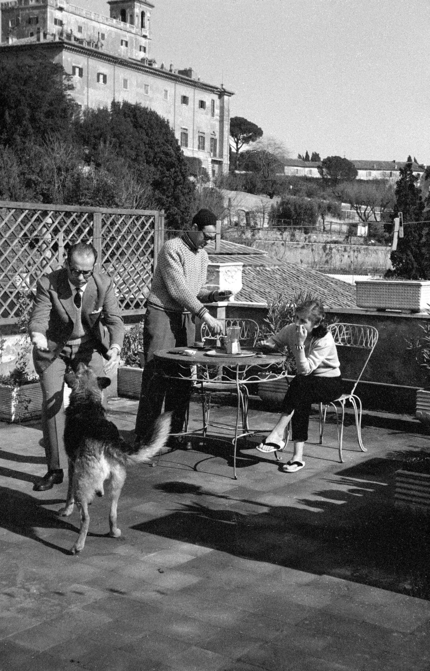 Black and white photograph of two men and a woman on a stone terrace; one man bends toward a rearing dog while the others stand and sit at a wrought-iron café table
