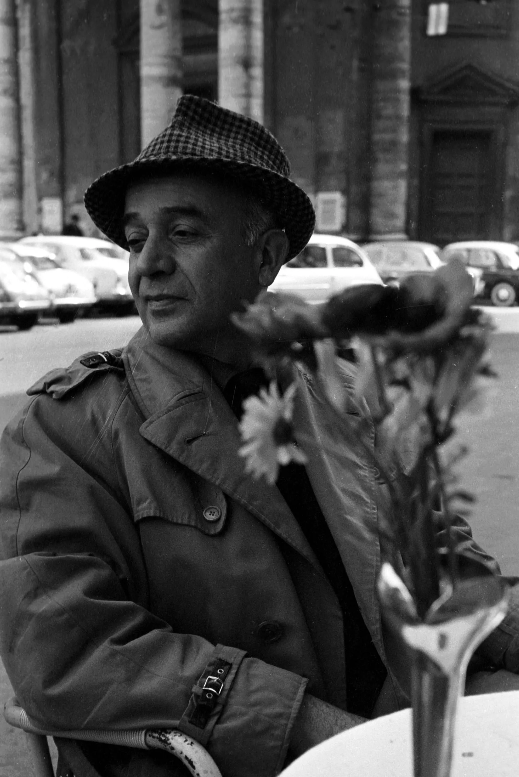 Black and white photograph, man in a houndstooth fedora and trench coat seated at an outdoor table, gaze directed downward, with an out-of-focus flower vase in the foreground and parked cars and a Classical building behind