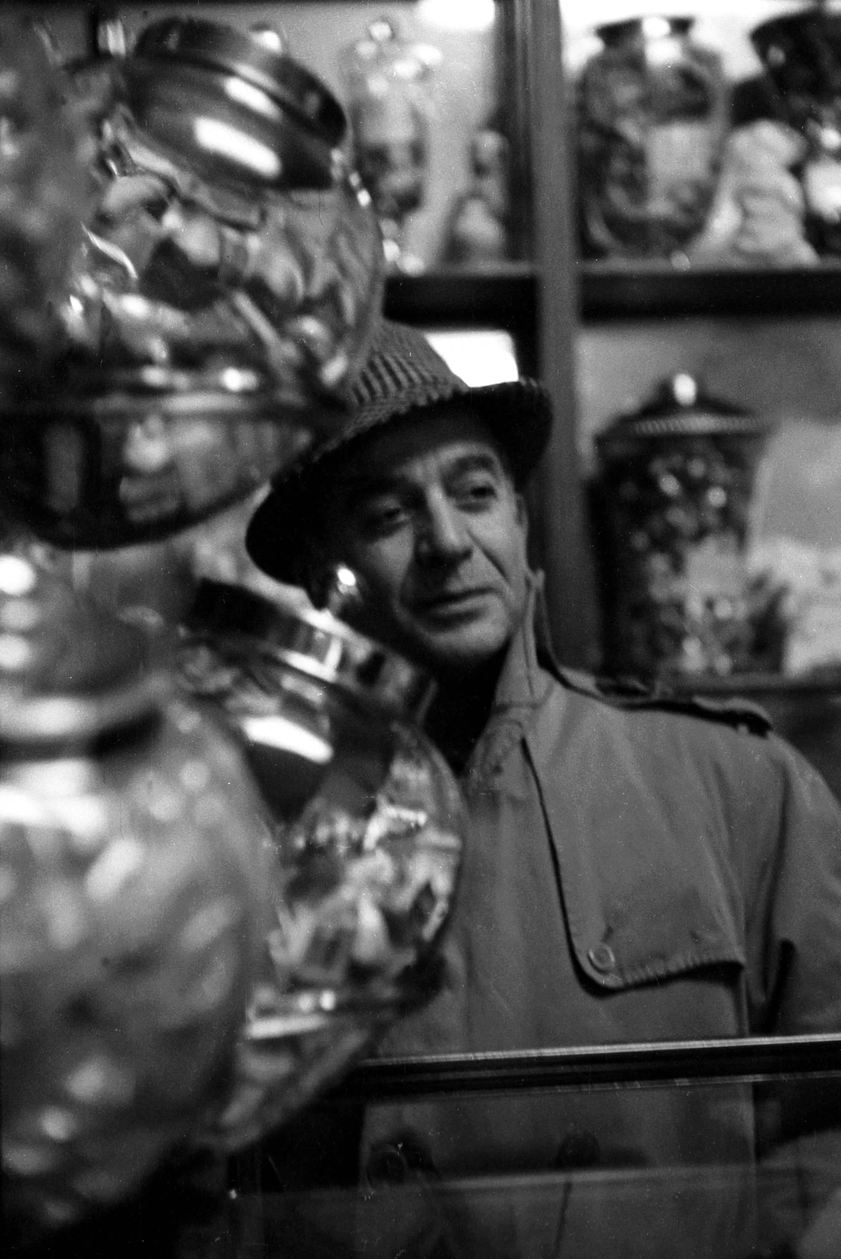 Black and white photograph of a white man in a knit hat and coat, partially framed by large out-of-focus glass vessels in the foreground, shelves of ceramics behind him