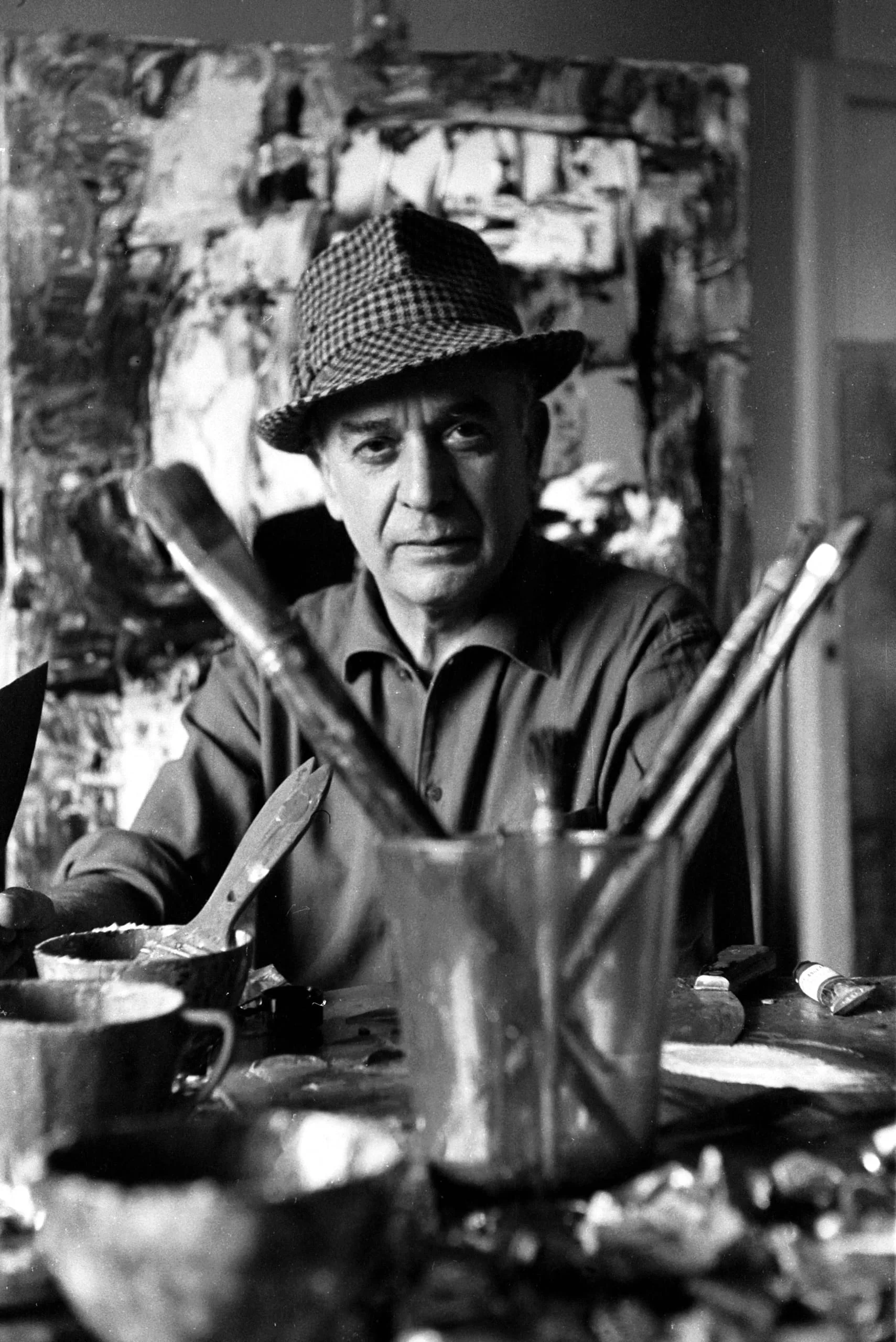 Black and white photograph of a white man in a houndstooth fedora seated behind a table crowded with paintbrushes and tools, a heavily textured abstract painting visible behind him