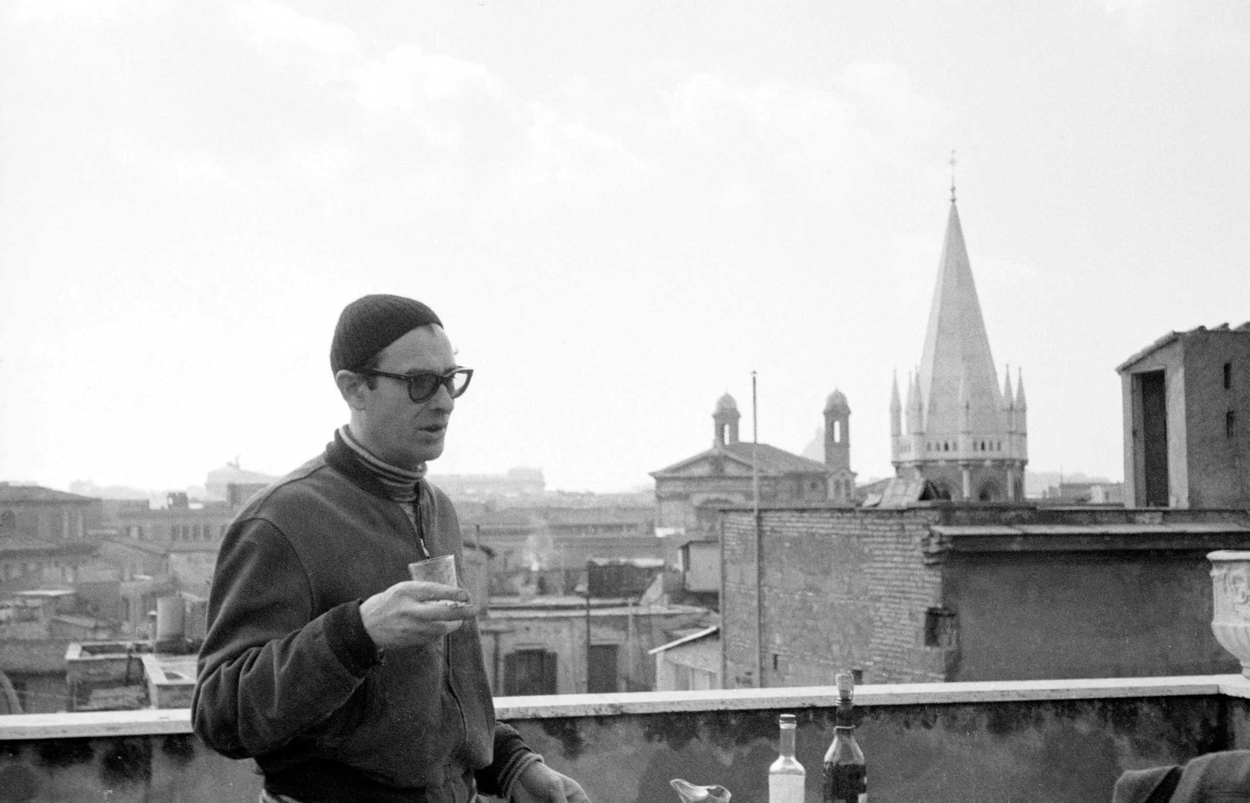 Black and white photograph of a white man in glasses and a knit cap holding a small glass on a rooftop, with a city skyline and church spire behind him