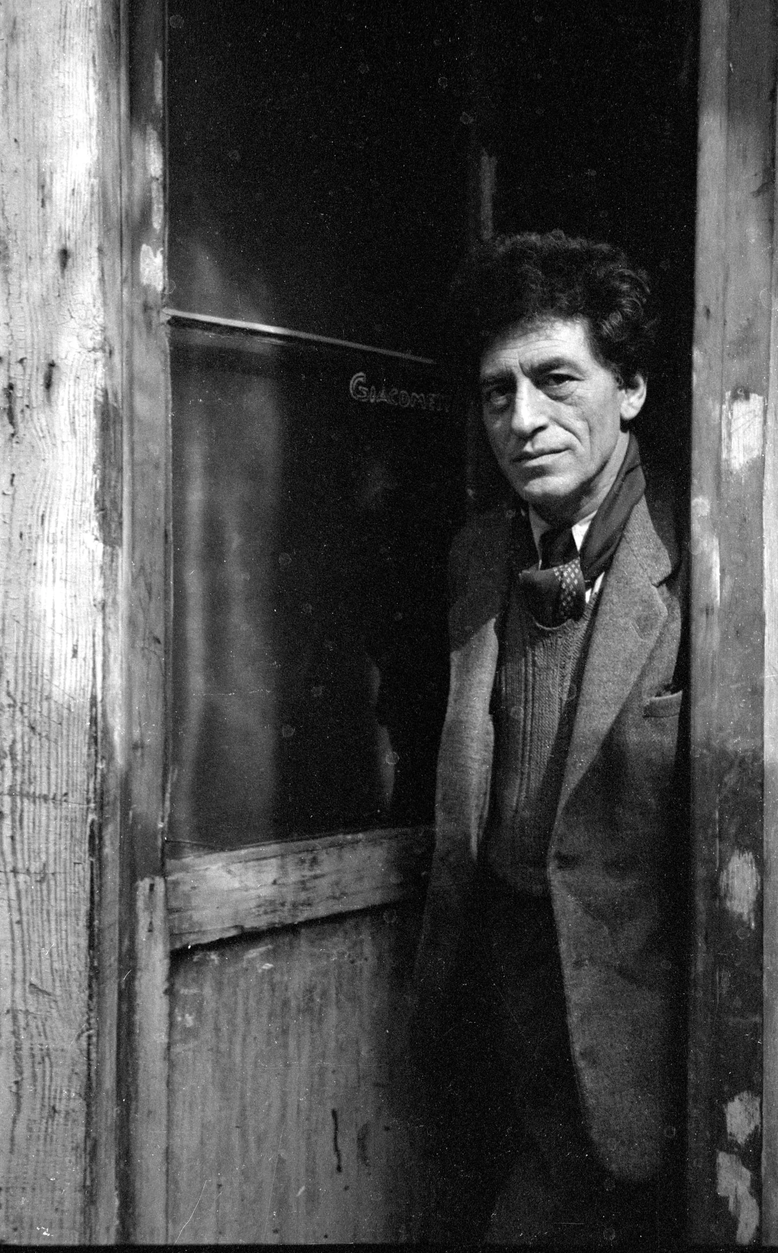 Black and white photograph of a lean man with disheveled dark hair standing in a rough wooden doorway, looking directly at the camera, wearing a wool coat and loosely knotted tie