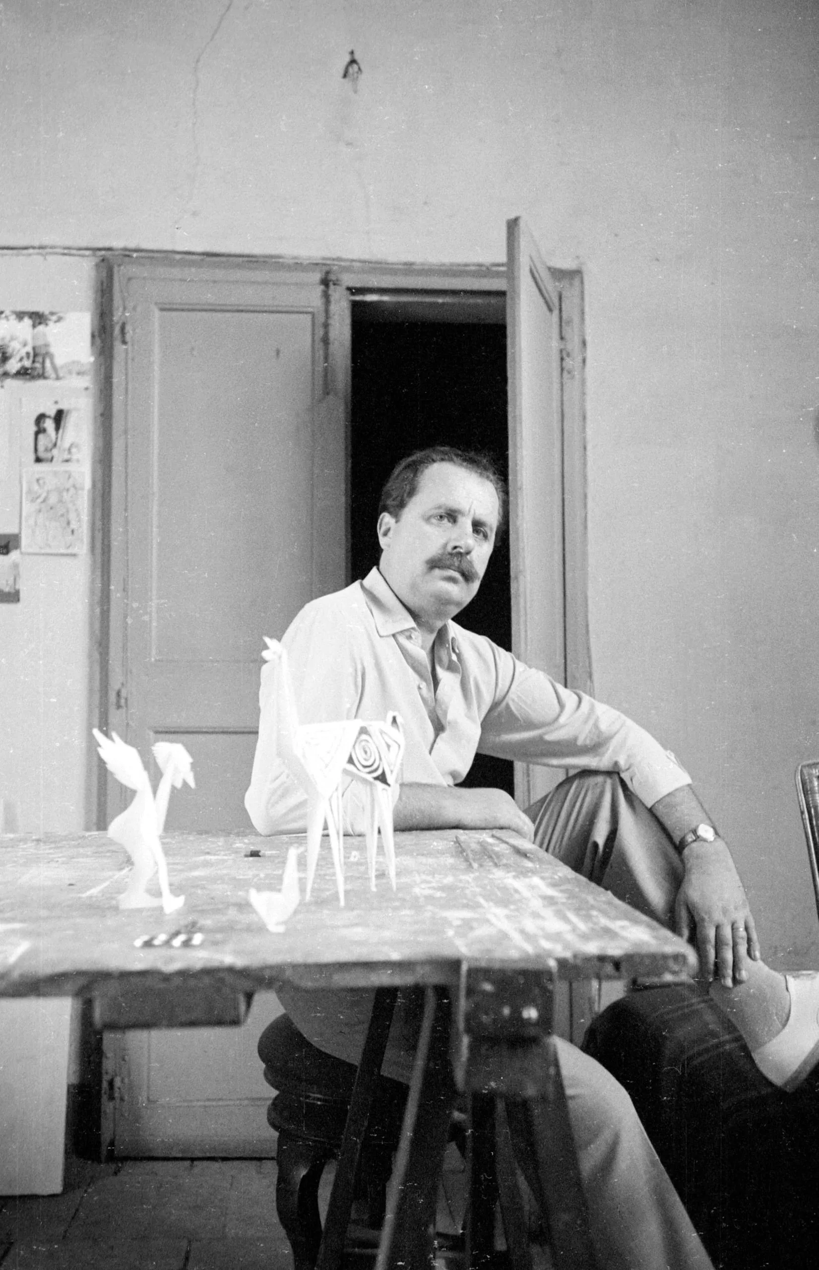 Black and white photograph of a man with a mustache seated at a paint-stained worktable, two small white sculptural figures in front of him, open window behind