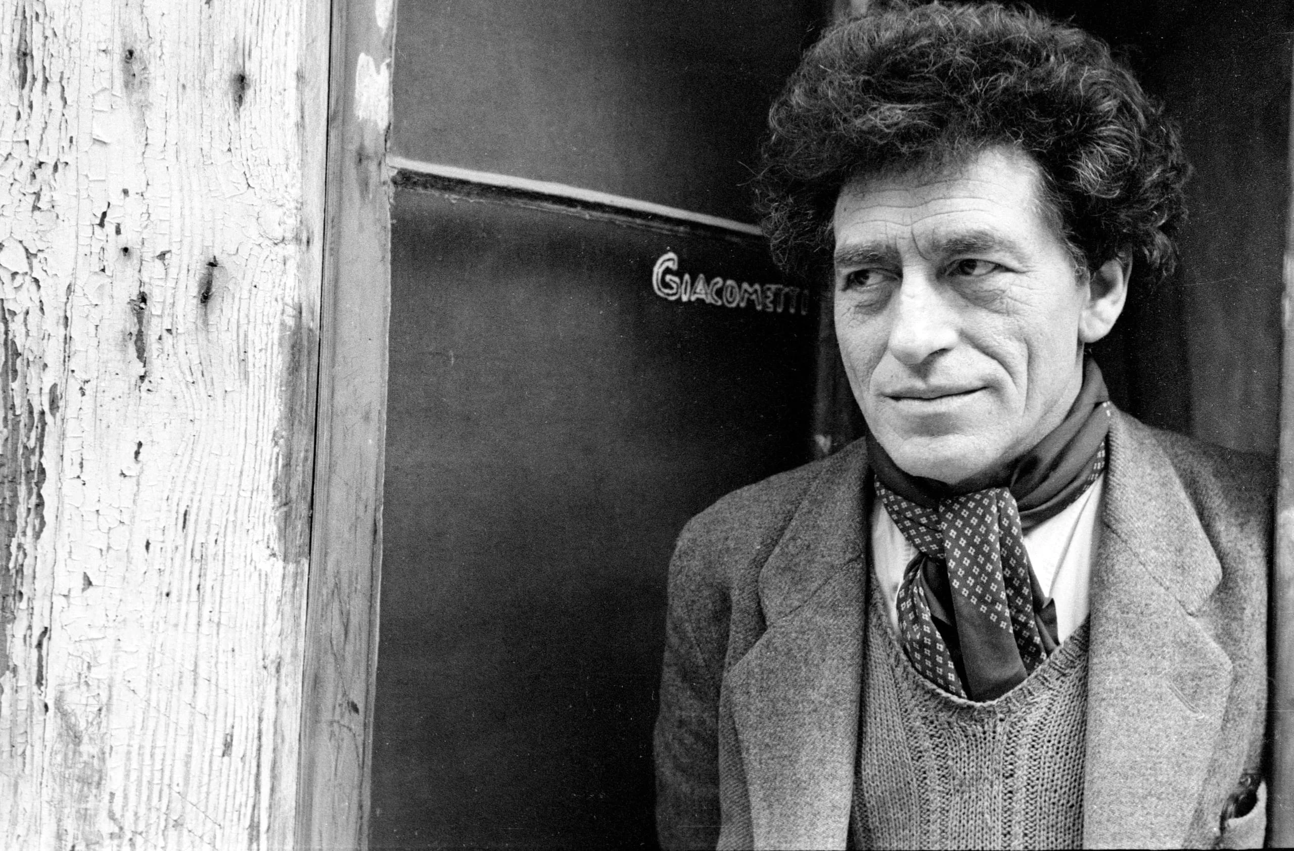 Black and white photograph, man from the chest up in a doorway, wearing a tweed blazer and loosely knotted dotted scarf, with the name 'Giacometti' written on a dark surface behind him