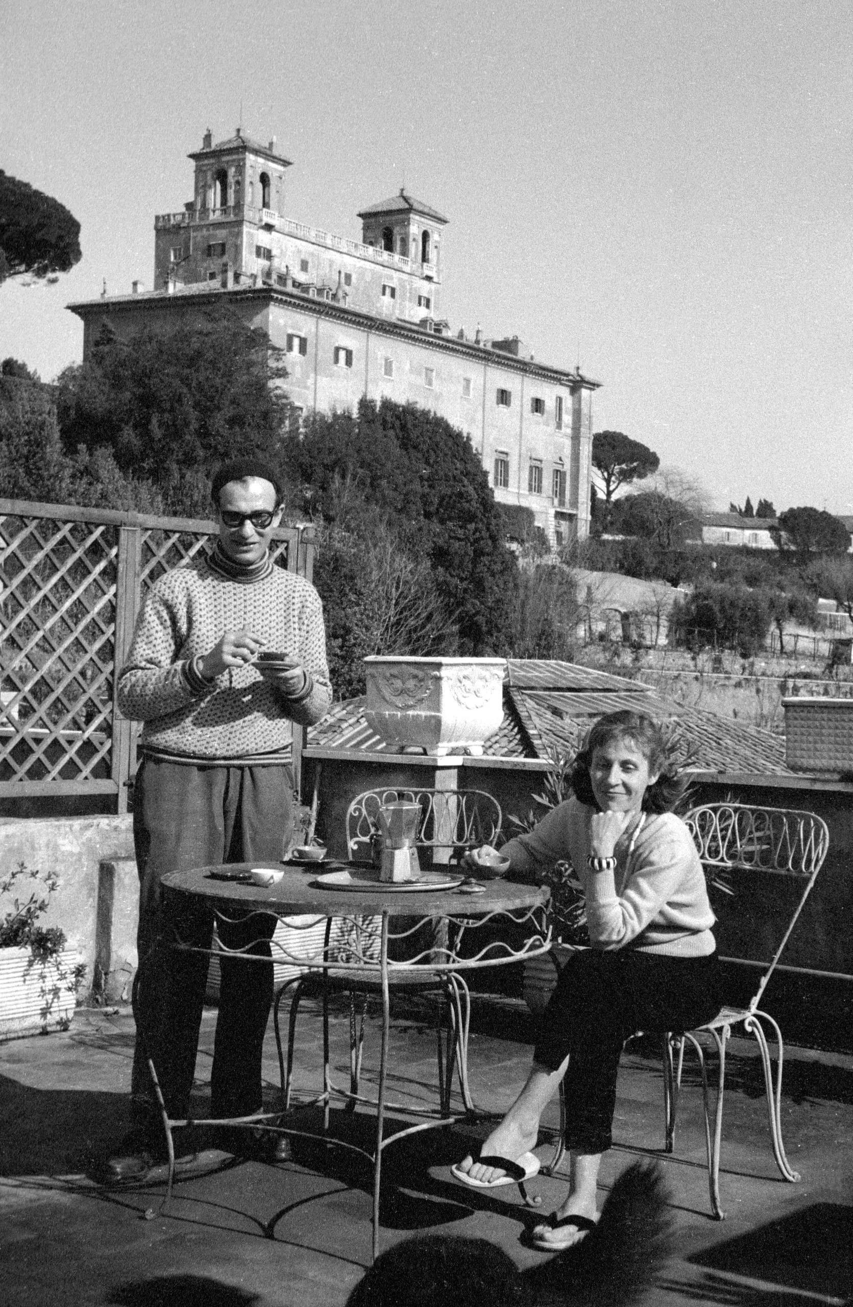 Black and white photograph of a man and woman on a rooftop terrace with a wrought-iron table, a large villa visible on a hill behind them