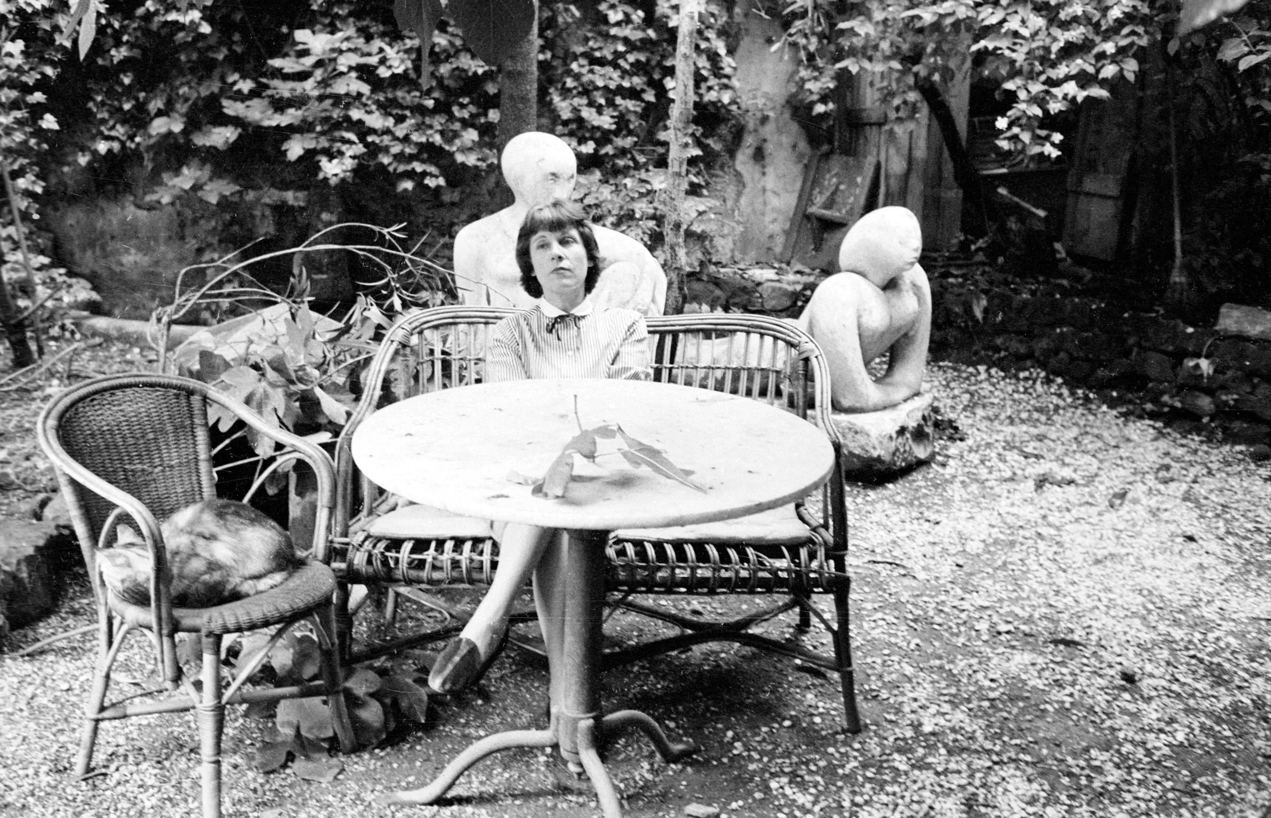 Black and white photograph of a woman with a short dark bob seated in a wicker garden chair at a round table, flanked by pale stone sculptures, with a cat asleep on a nearby chair