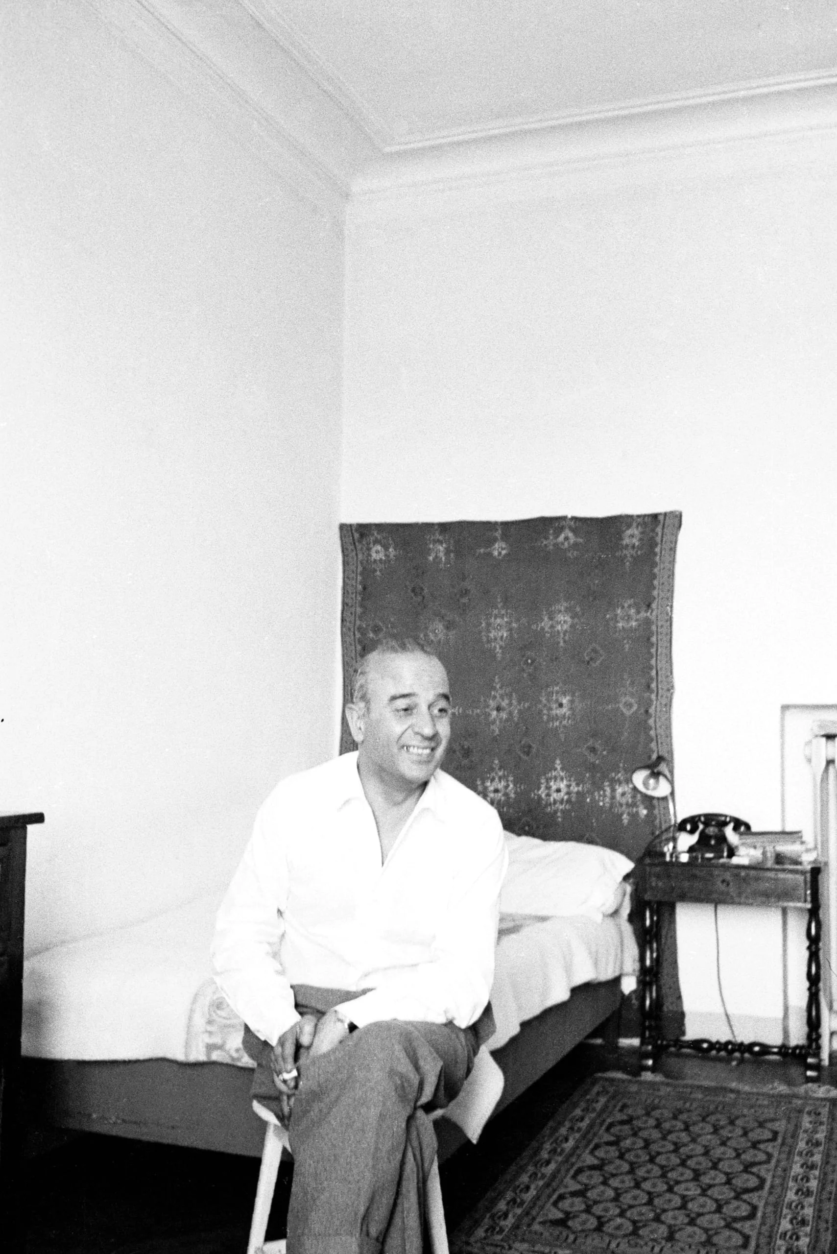 Black and white photograph of a man with brown skin seated in a chair in a sparse bedroom, smiling broadly, wearing a white open-collared shirt