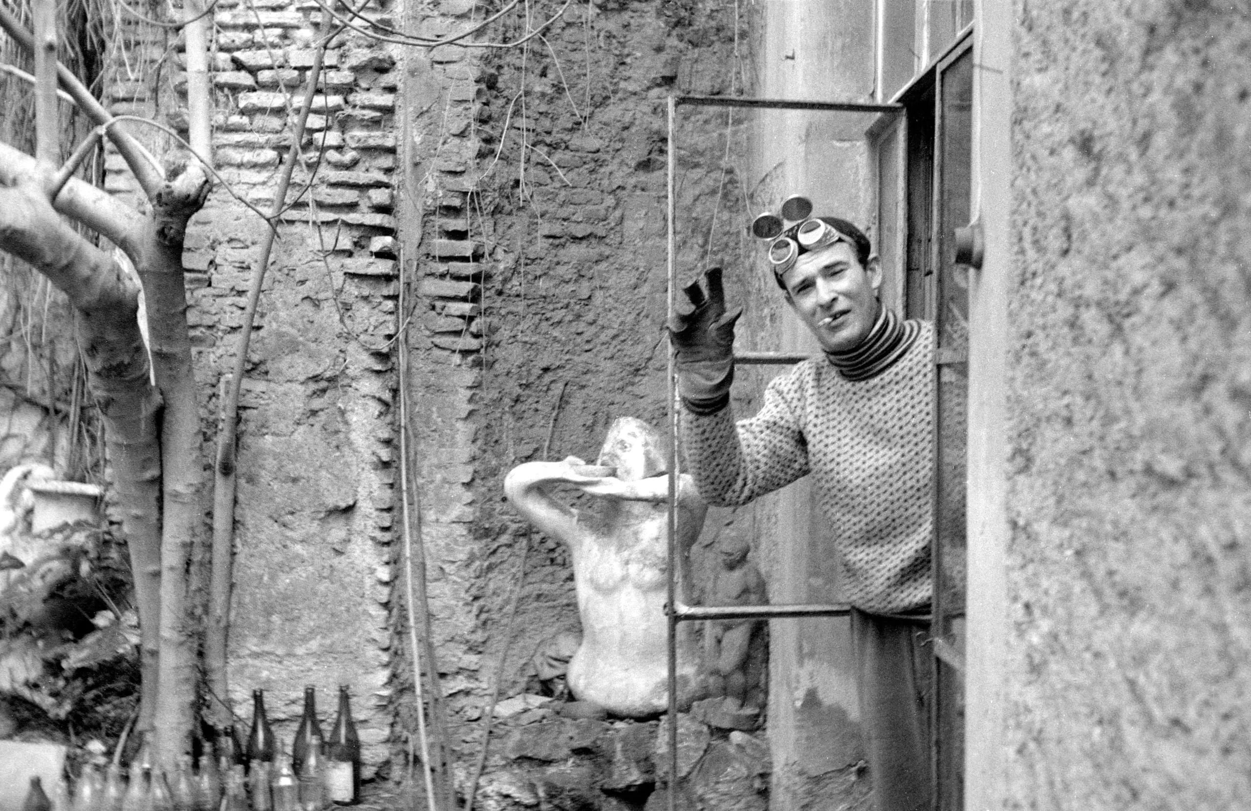 Black and white photograph of a man in a knit sweater and goggles leaning from a doorway, raising two fingers, beside a small figurative sculpture set into a crumbling brick wall