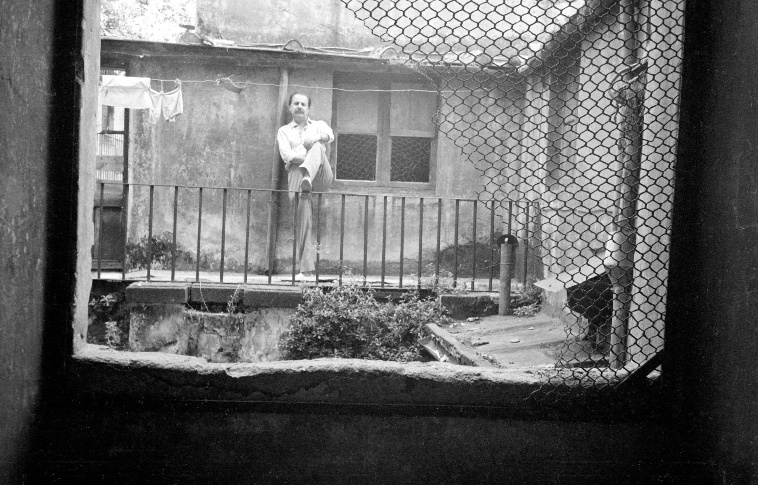 Black and white photograph shot through a screened window into a courtyard, where a man with a mustache leans against an iron railing in front of a weathered building