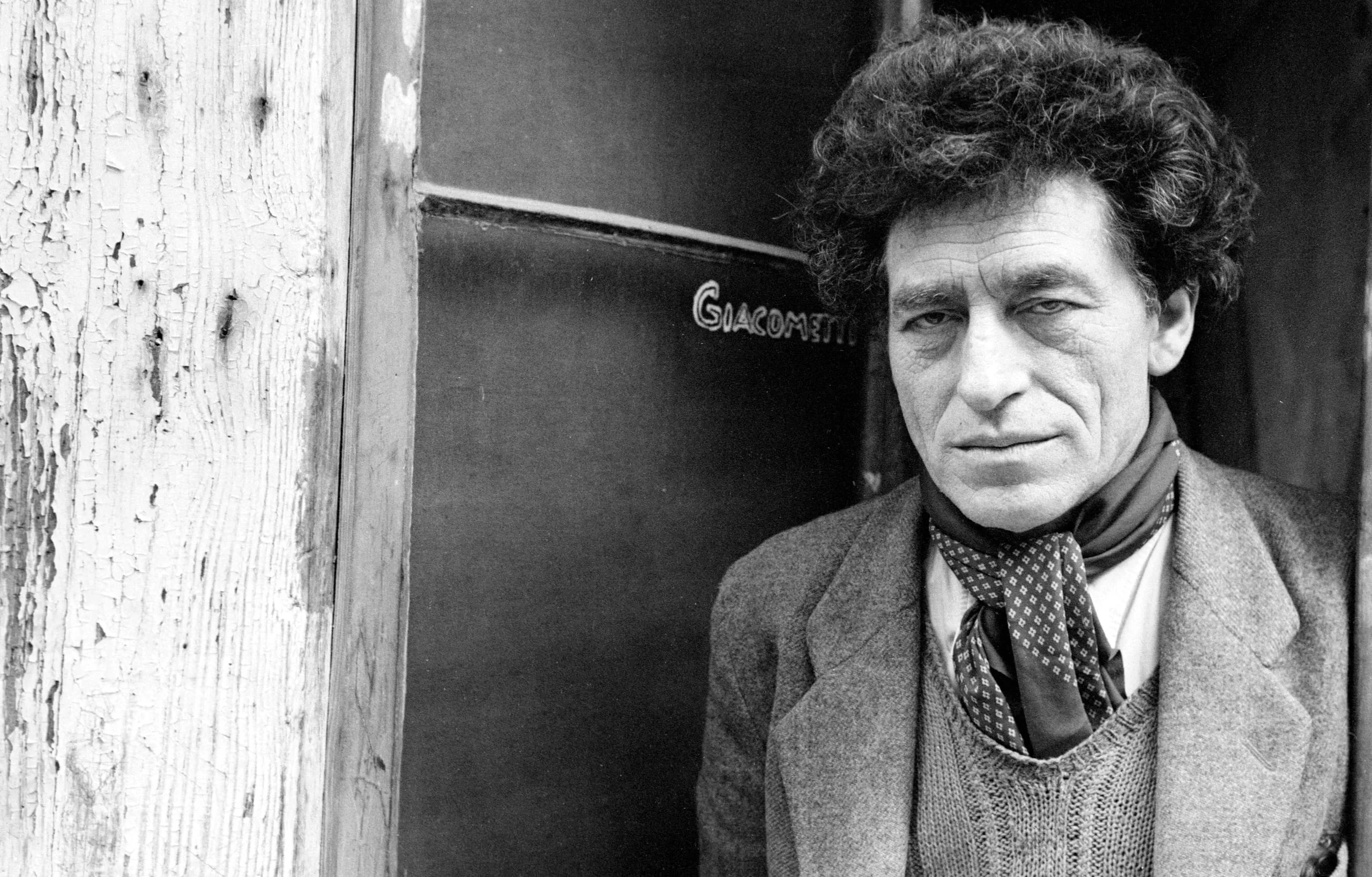 Black and white photograph, chest-up portrait of a curly-haired man in a wool blazer and knotted scarf, leaning against a doorframe with the word "Giacometti" written on the dark surface behind him