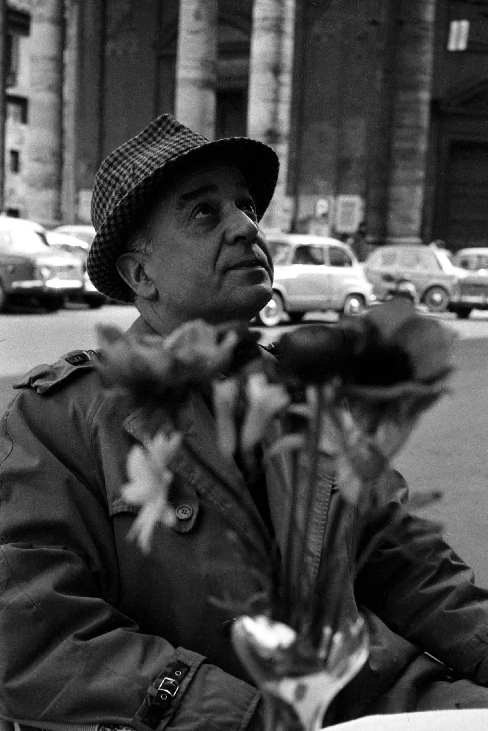 Black and white photograph, man in houndstooth cap and zip jacket seated outdoors, gazing upward, with out-of-focus flowers in the foreground and parked cars behind