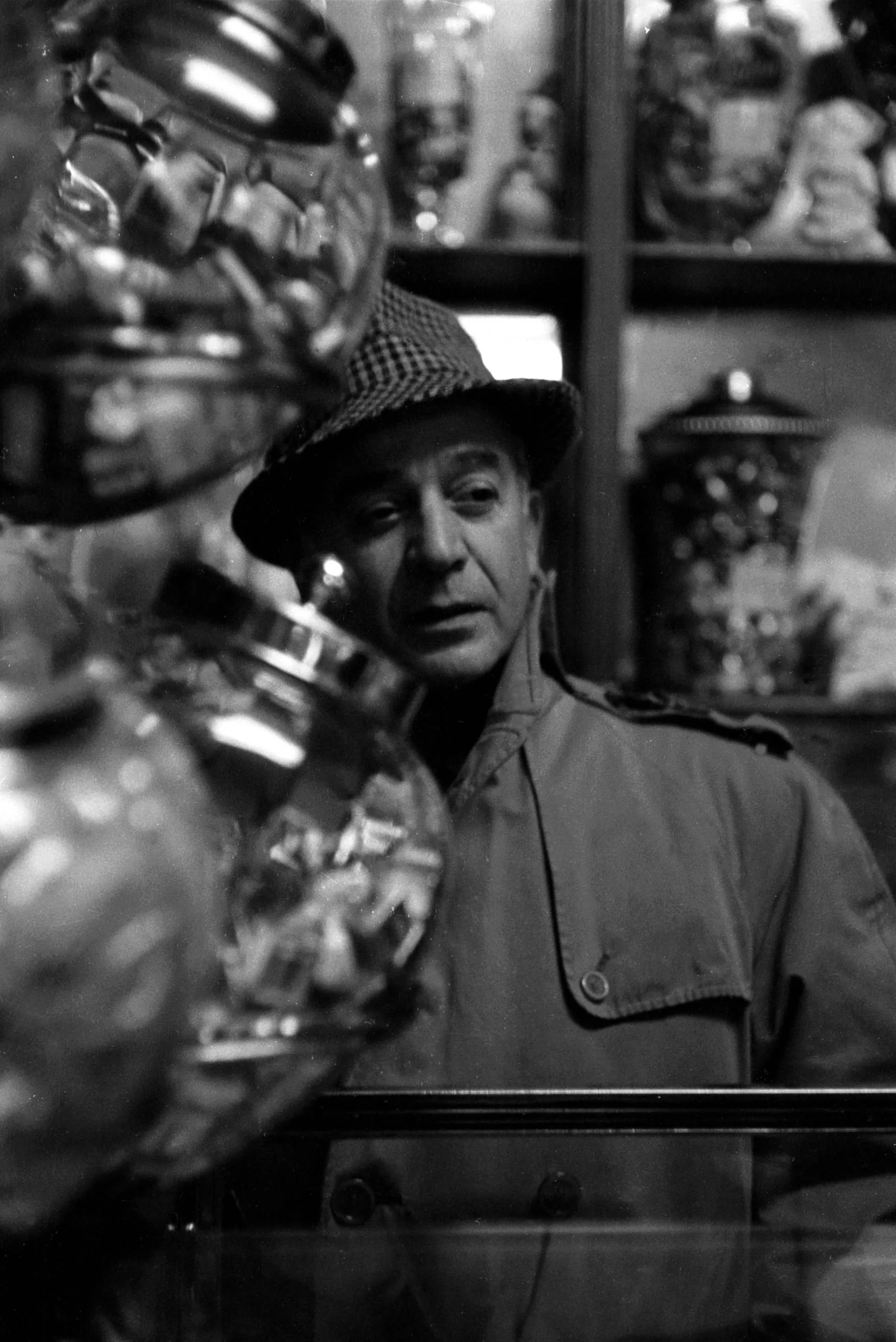 Black and white photograph, chest-up portrait of a man in a houndstooth cap and trench coat, partially obscured by blurred glass jars in the foreground, shelves visible behind him