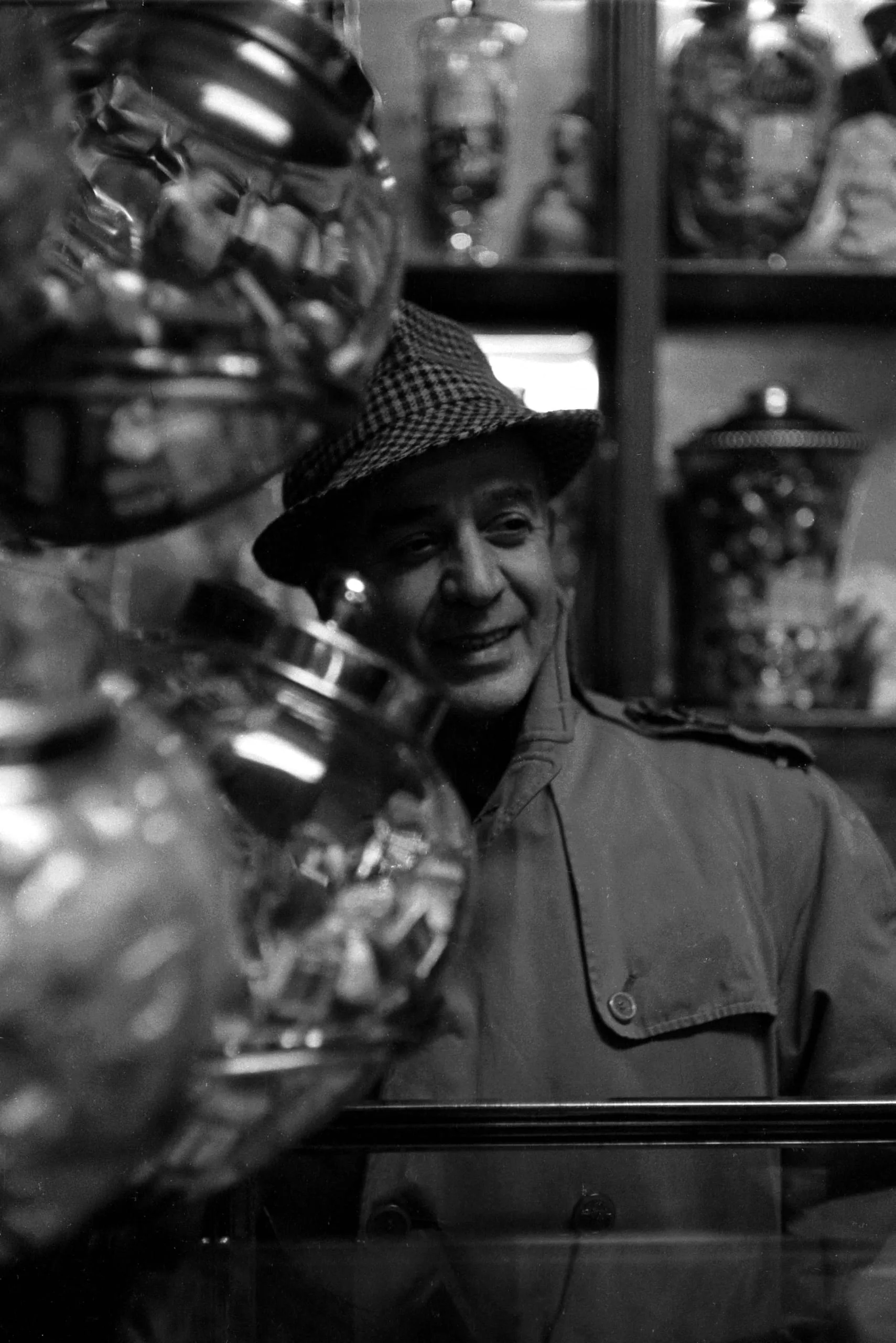Black and white photograph of a man in a houndstooth fedora and trench coat, smiling behind glass candy jars in a shop