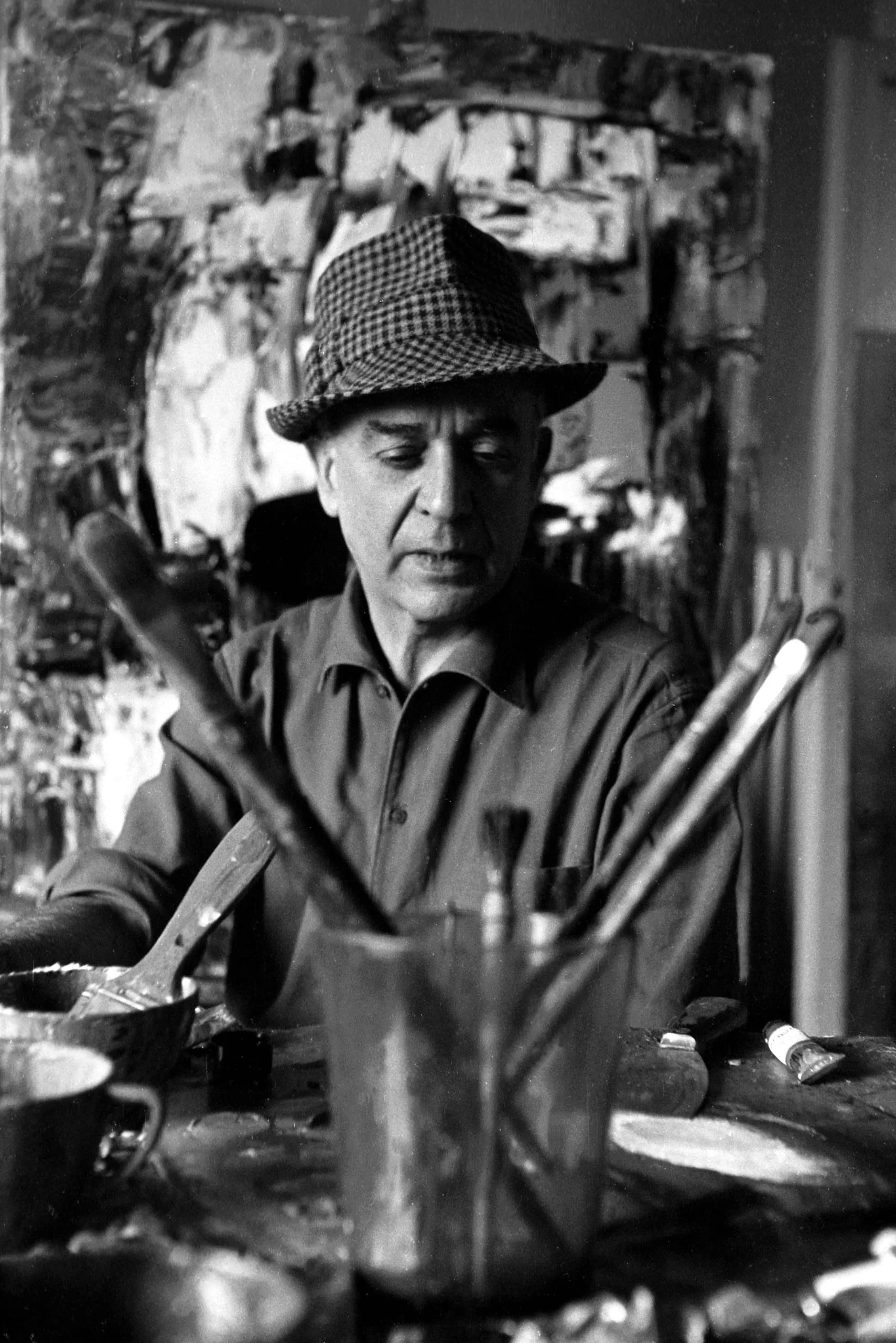 Black and white photograph of a white man in a houndstooth fedora, waist-up, looking down at a paint-covered work surface with brushes and tools in the foreground