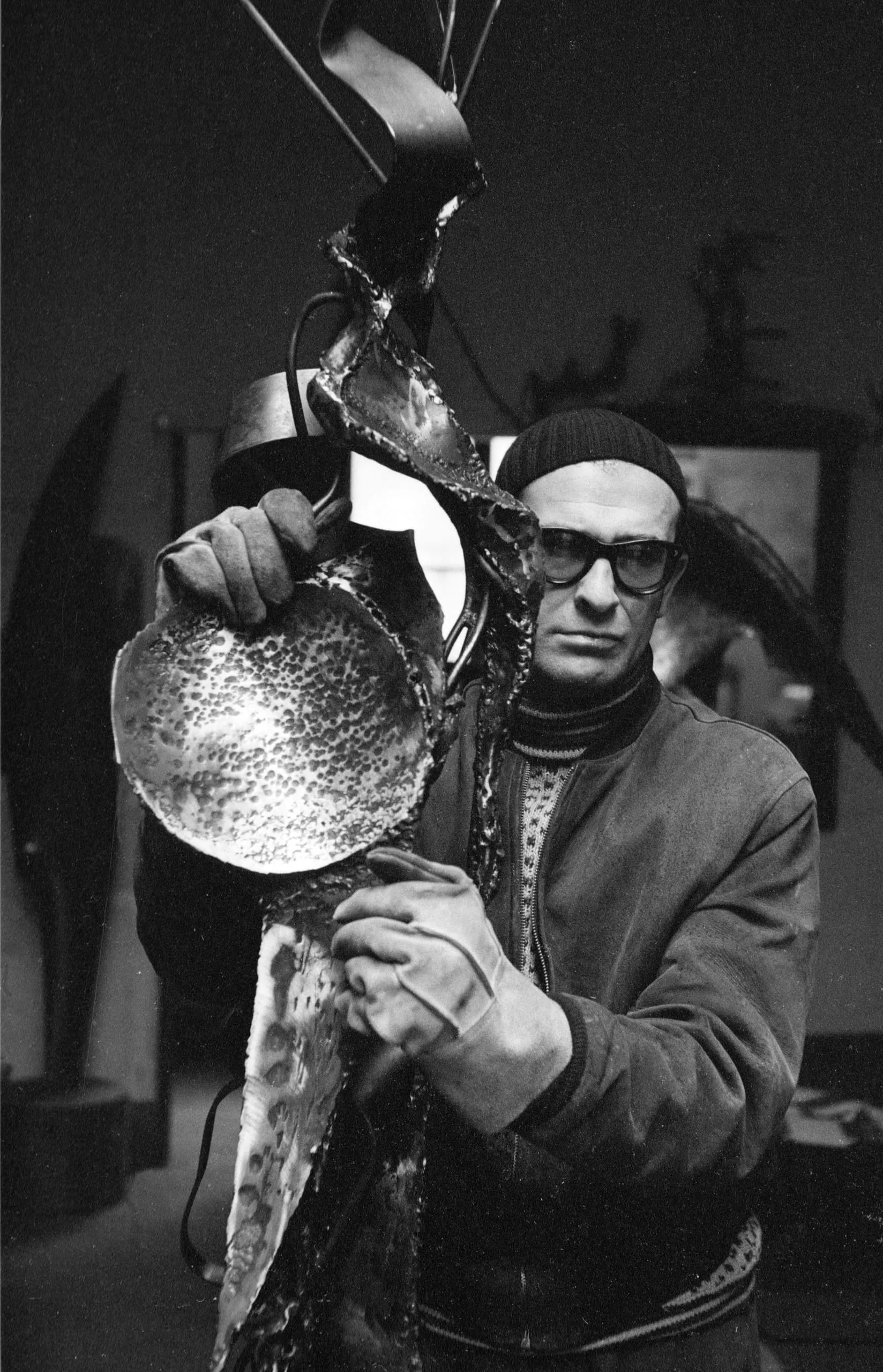 Black and white photograph of a man in glasses and knit cap gripping a large welded metal sculpture with a heavily textured, pitted surface