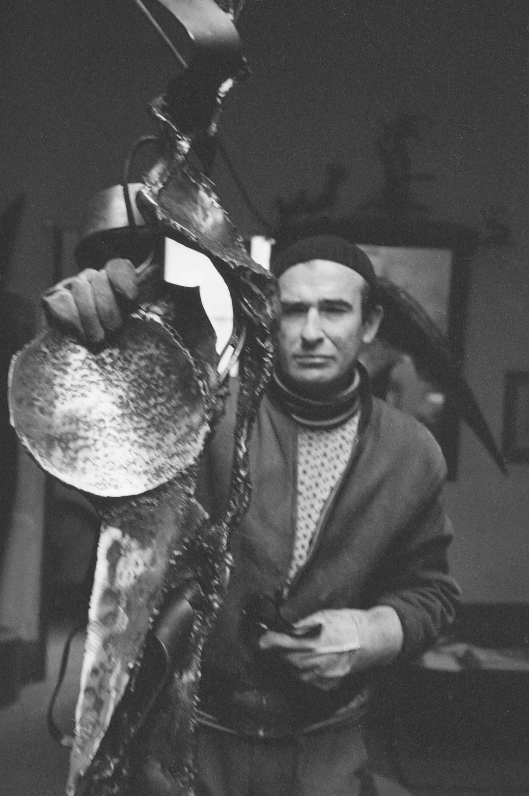 Black and white photograph of a man in a knit turtleneck and cap holding a large, textured metal sculpture with jagged welded forms, in a studio setting