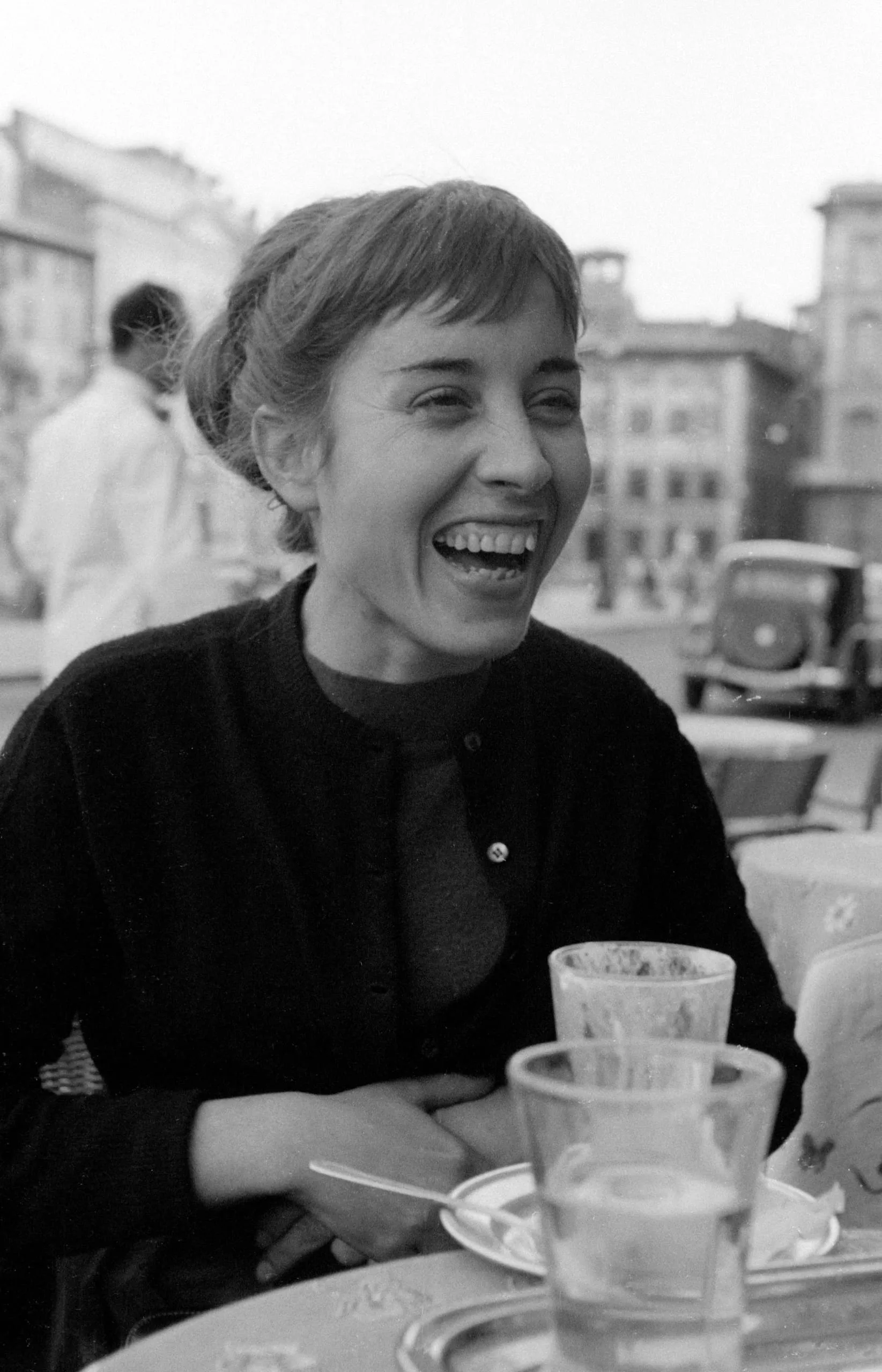 Black and white photograph of a young woman at an outdoor café table, laughing with mouth open wide, wearing a dark cardigan, with a European plaza visible behind her
