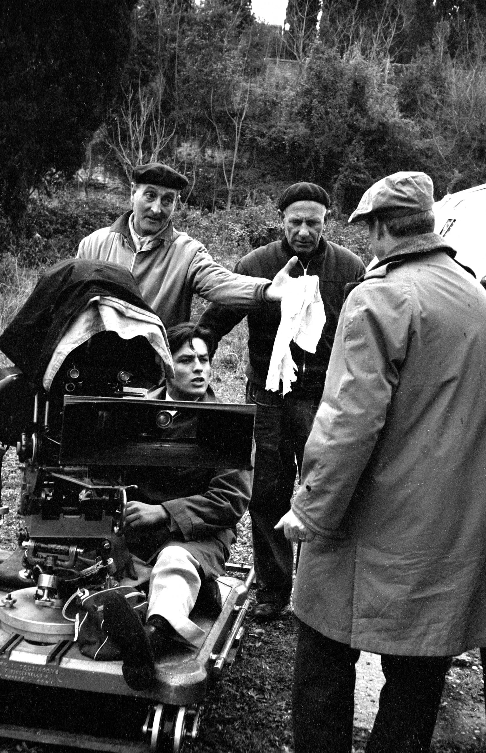 Black and white photograph of four men on an outdoor film set, gathered around a large motion picture camera on a wheeled dolly, with a wooded hillside behind them