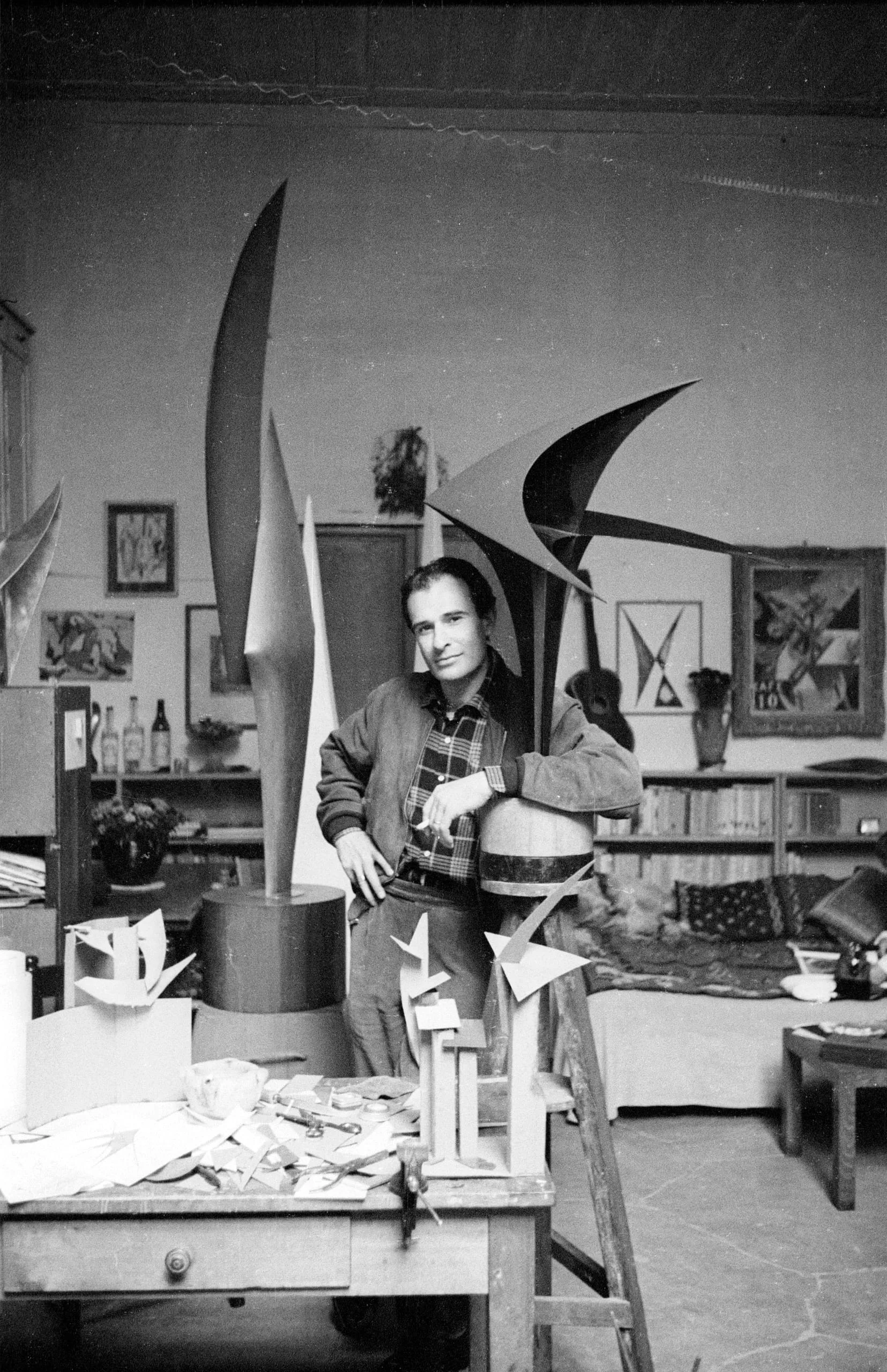 Black and white photograph of a man in a plaid shirt standing among large blade-like metal sculptures in an artist's studio, with small maquettes on a worktable in front of him