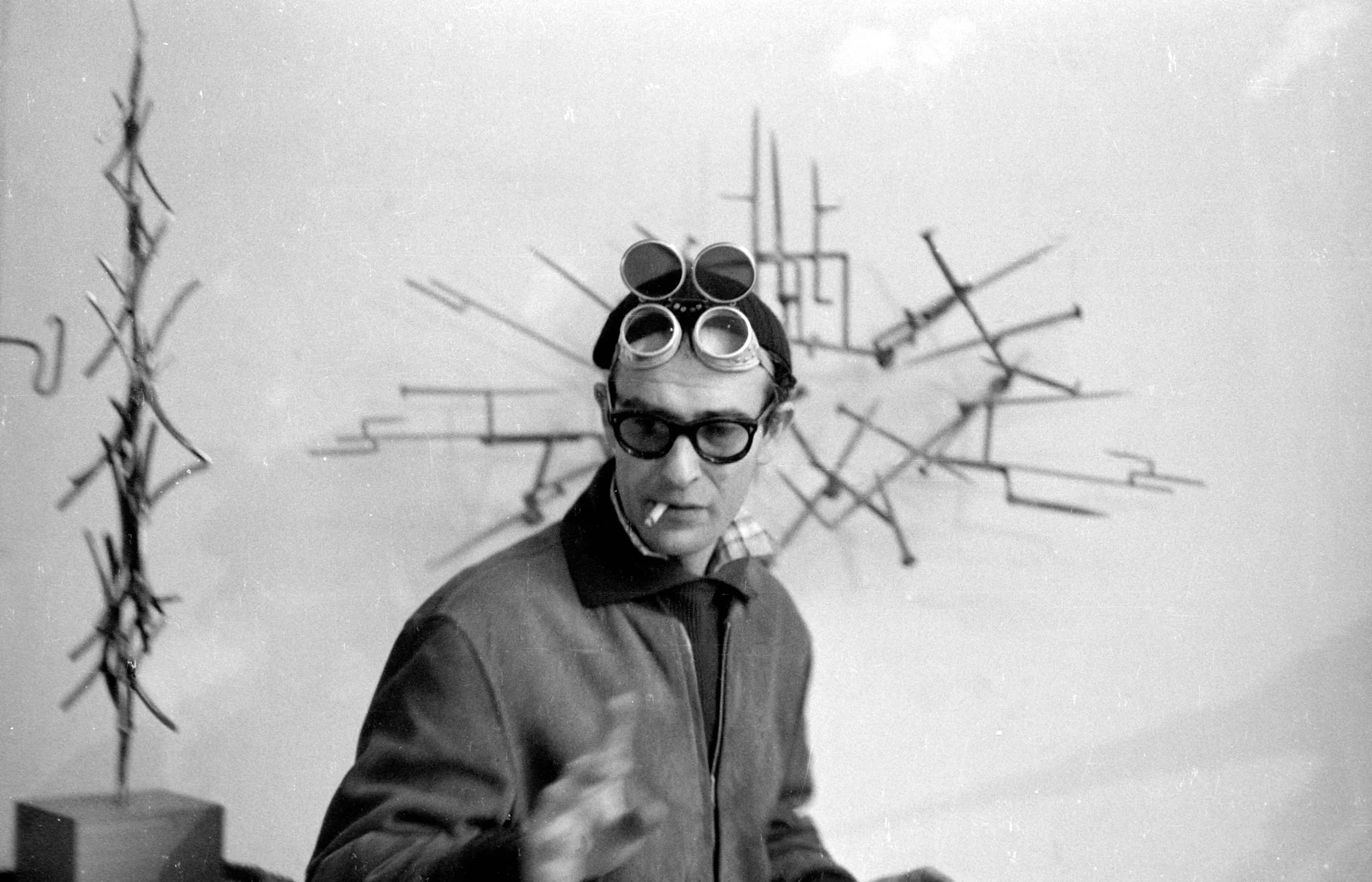 Black and white photograph of a white man from the chest up, wearing thick-framed glasses and welder's goggles on his forehead, a cigarette at his lips, with abstract metal rod sculptures visible behind him