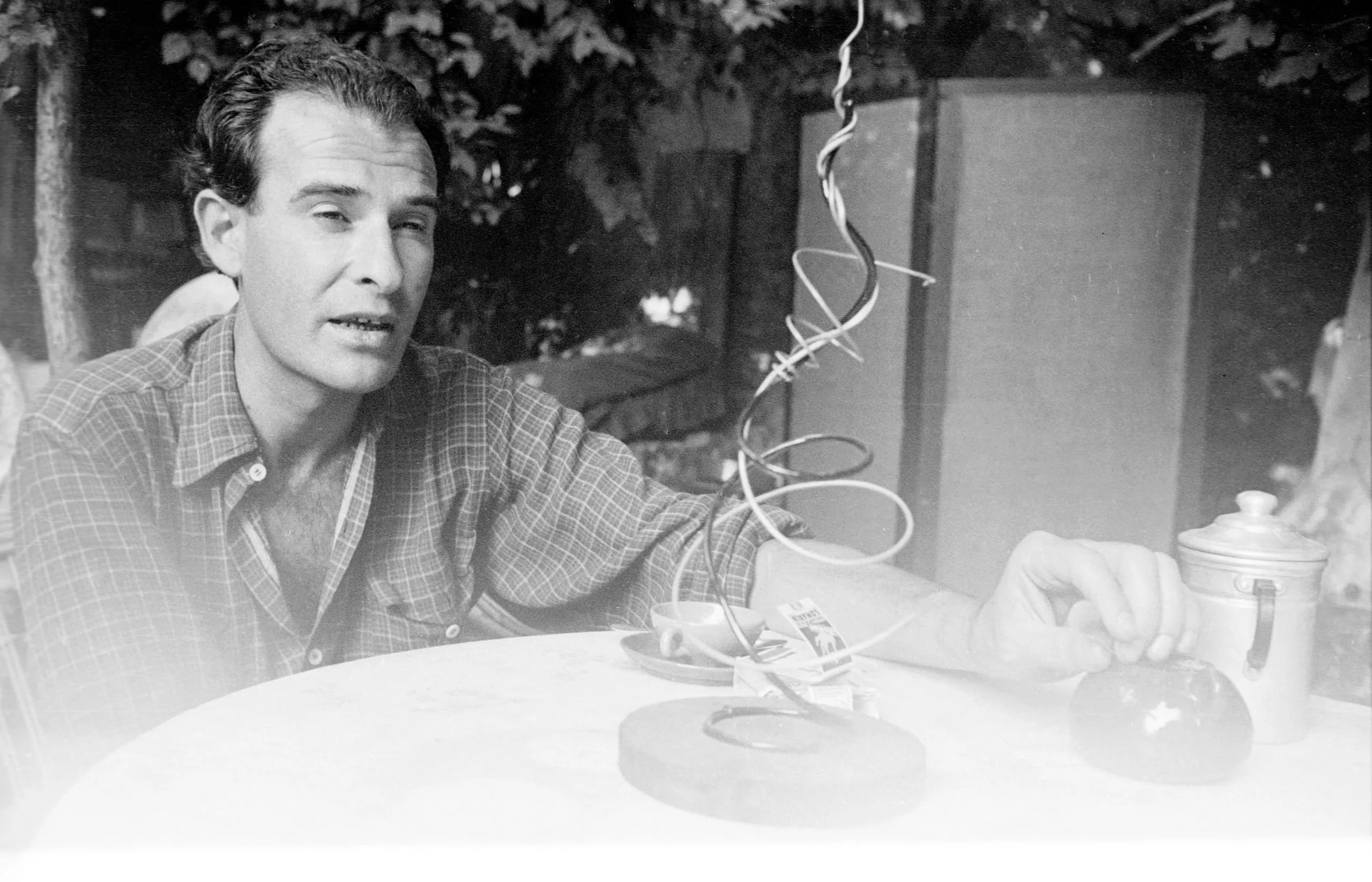 Black and white photograph of a man in a plaid shirt seated at an outdoor table, looking to the side, with a wire sculpture on the table in front of him
