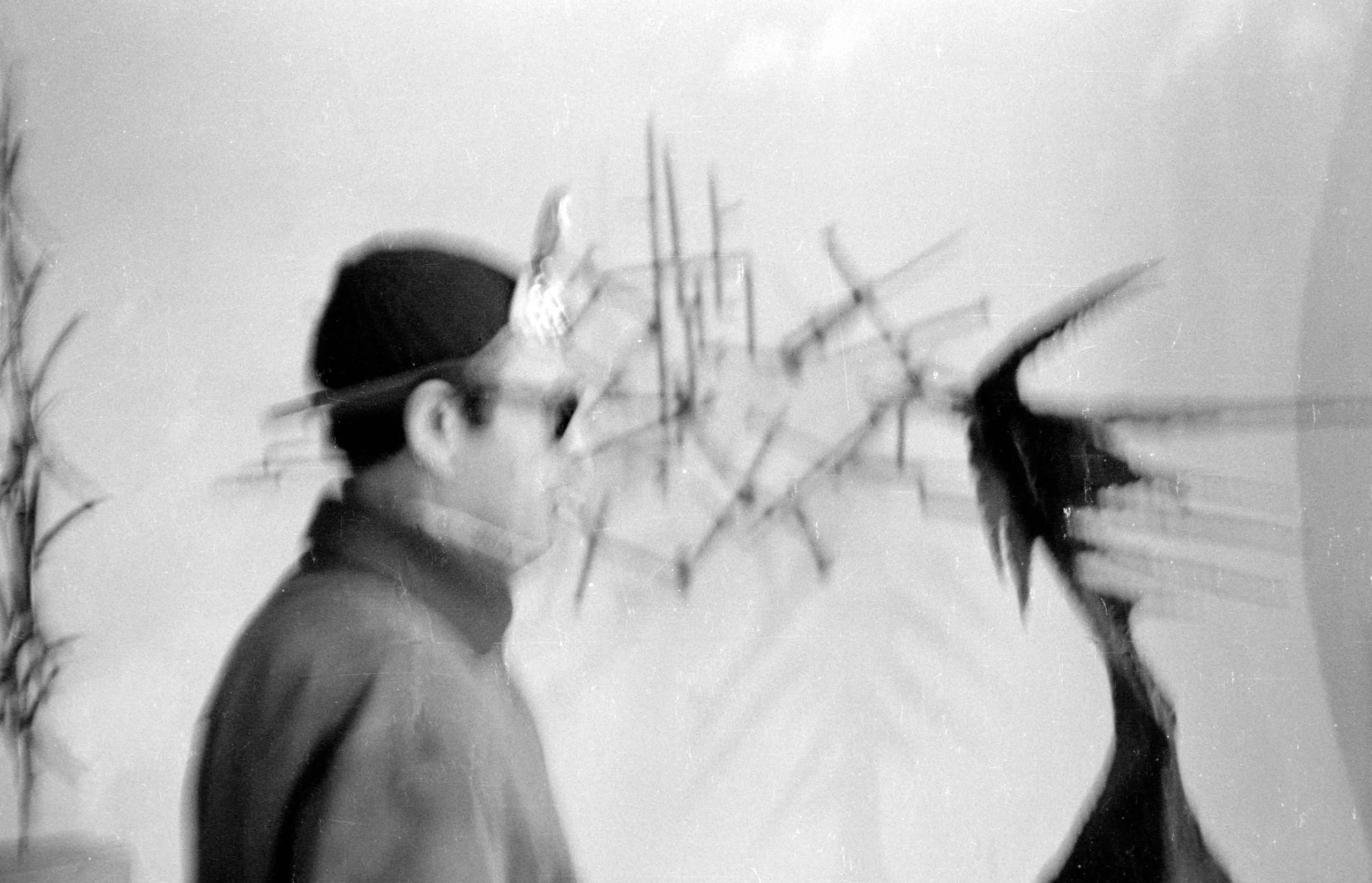 Blurred black and white photograph of a man in profile wearing a backward cap, standing before a sculptural arrangement of angular rods