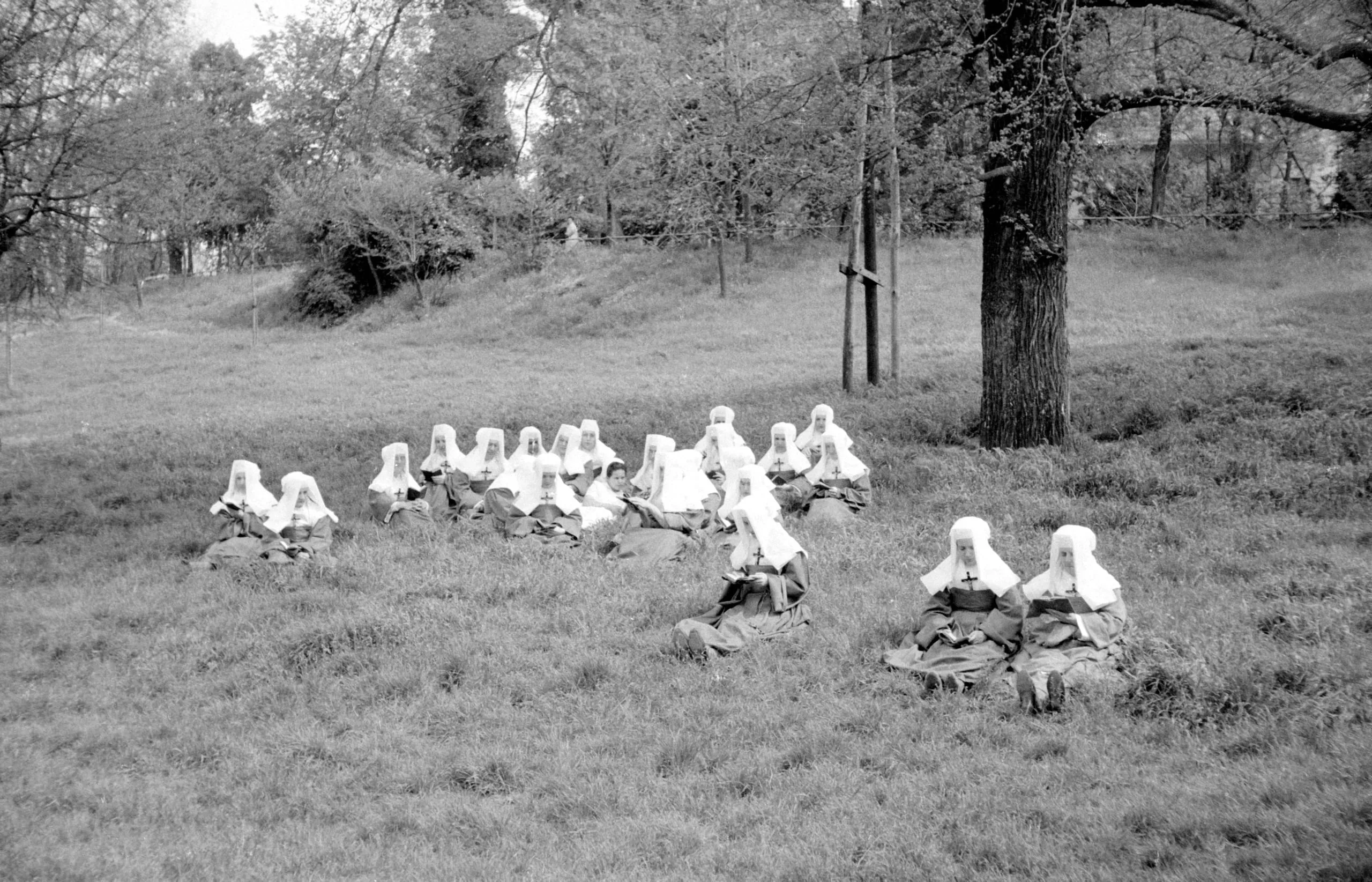 Black and white photograph of a large group of Catholic nuns in dark habits and white wimples seated on a grass hillside, with trees and a wooden cross in the distance