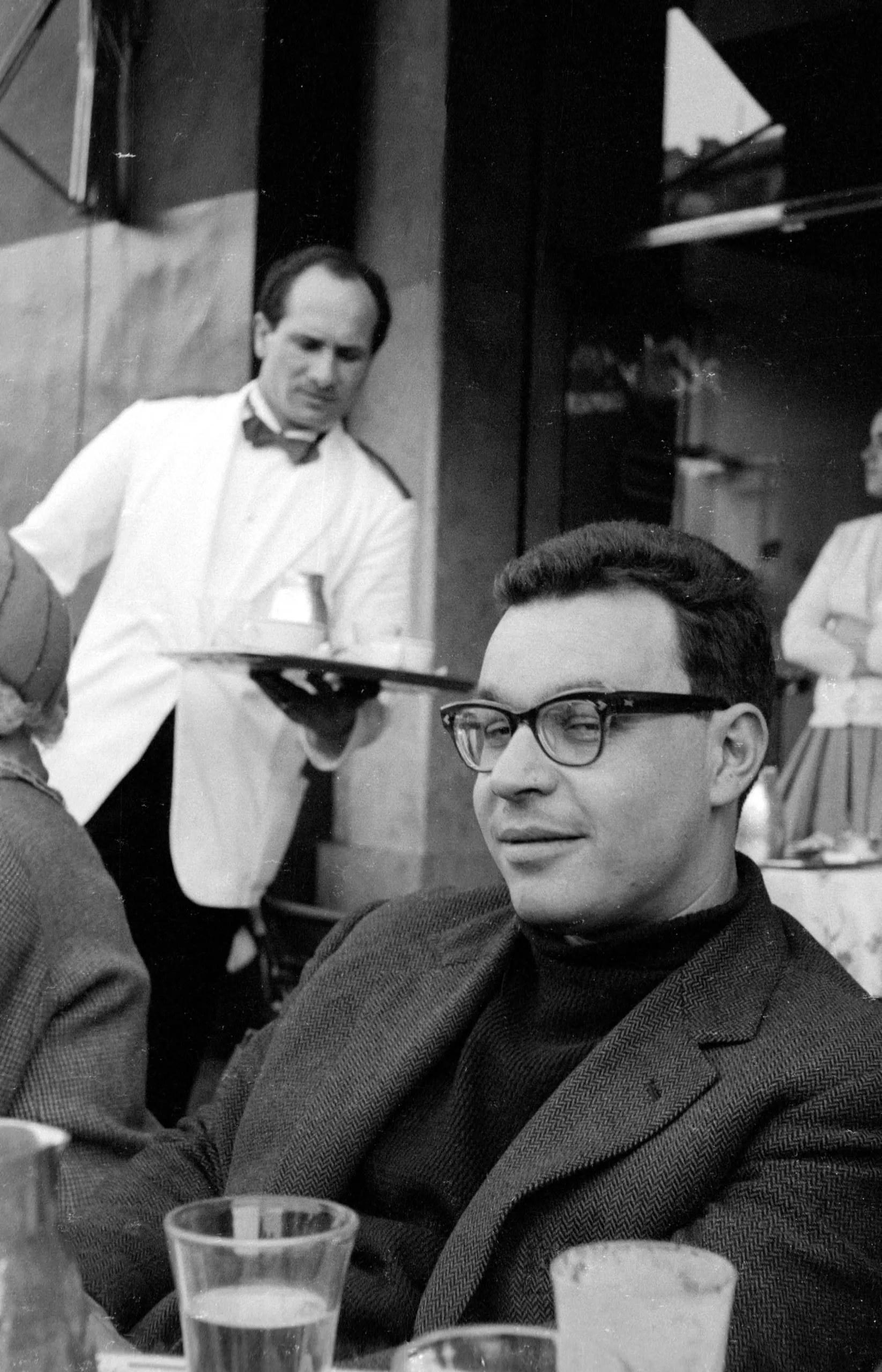Black and white photograph of a man in glasses and tweed jacket seated at an outdoor café table, a waiter with a tray visible behind him