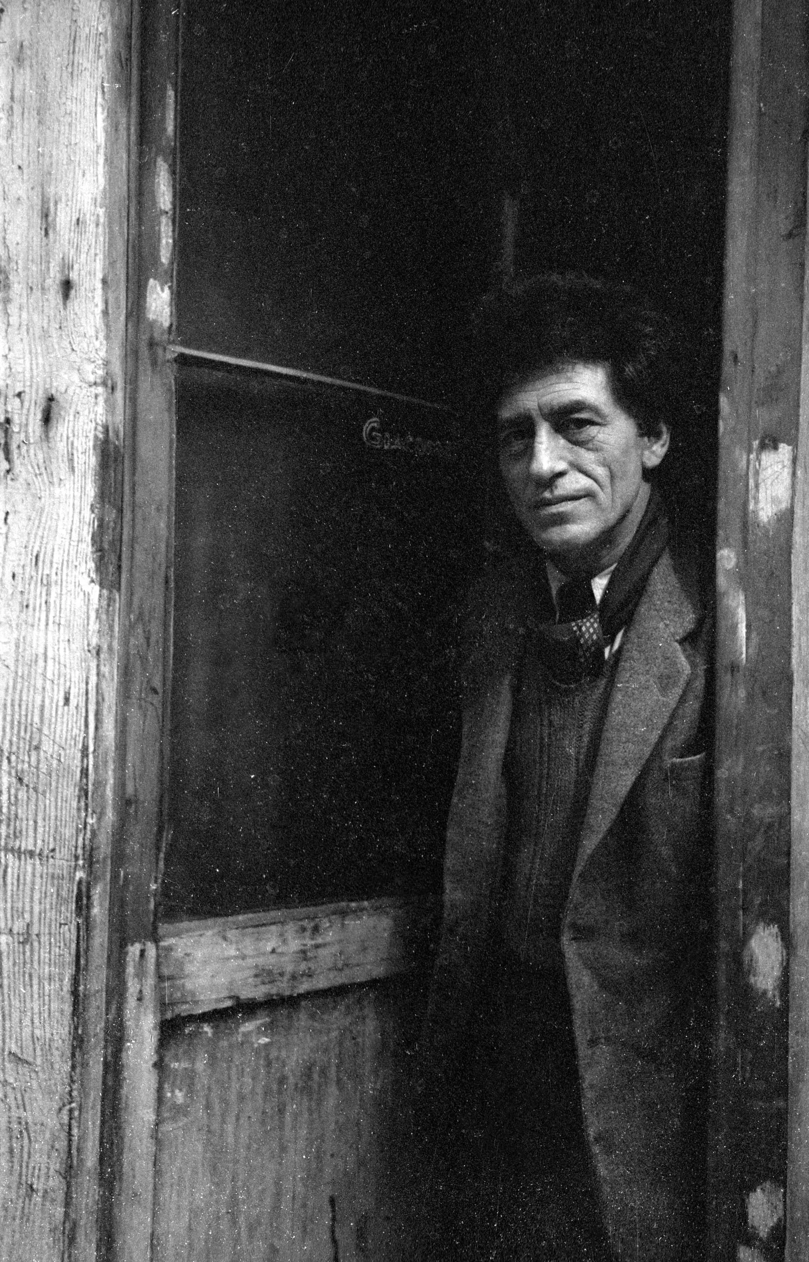 Black and white portrait photograph of a lean man in a heavy overcoat standing in a weathered wooden doorway, looking directly at the camera