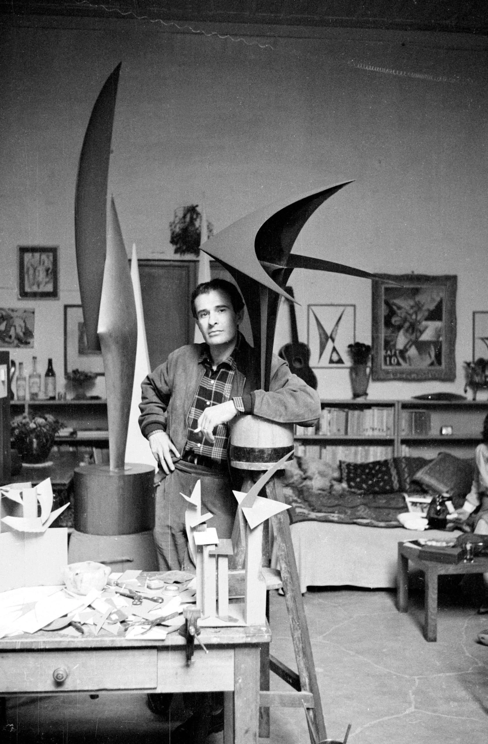 Black and white photograph of a person standing among abstract sculptures in an artist's studio, surrounded by tall spike-like forms and a cluttered worktable