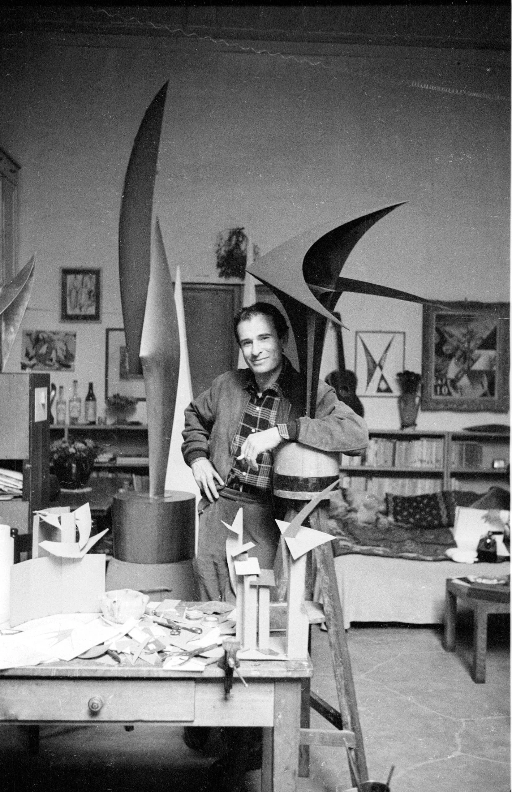 Black and white photograph of a woman in a plaid shirt standing among large metal sculptures in an artist's studio, with paper maquettes on a worktable in front of her