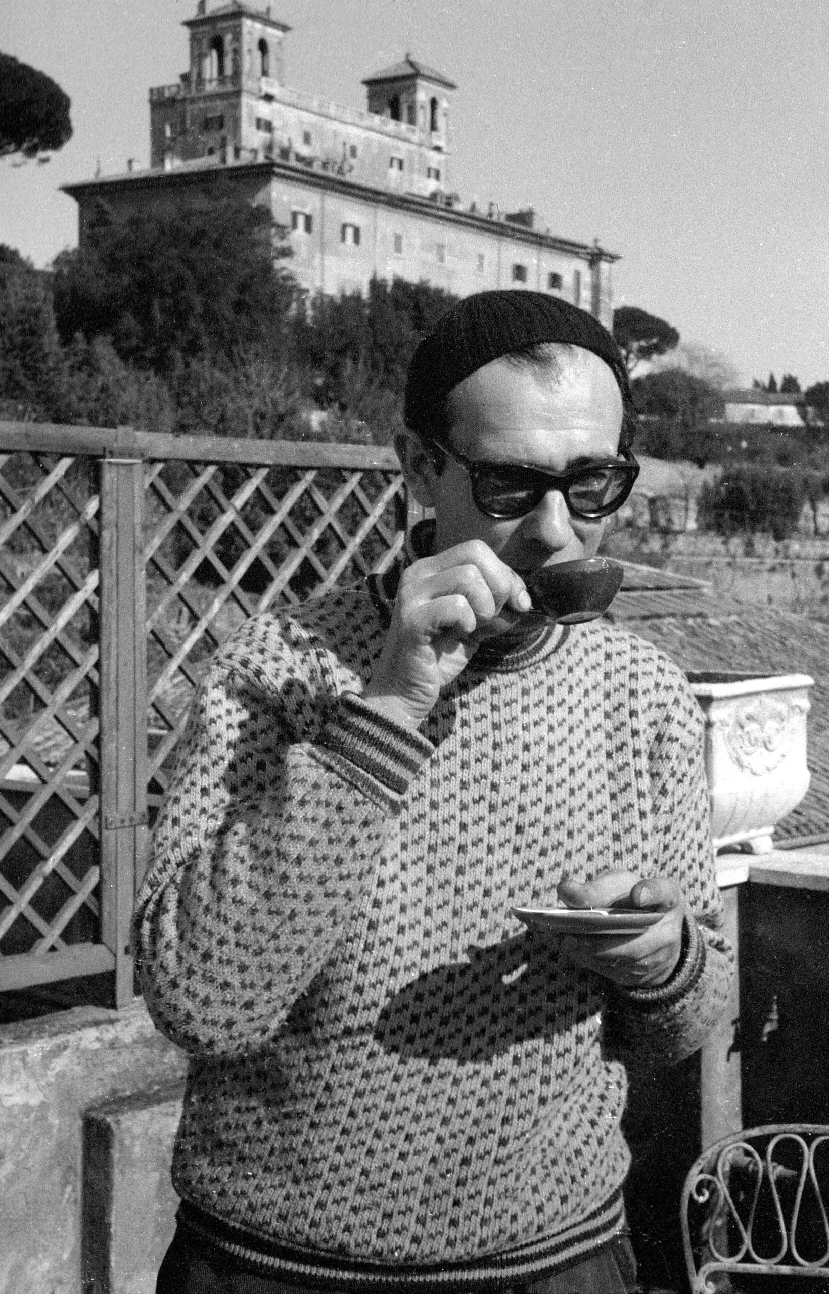 Black and white photograph of a man in a knit cap, sunglasses, and textured sweater drinking from a small espresso cup on an outdoor terrace, with a large historic building visible in the distance