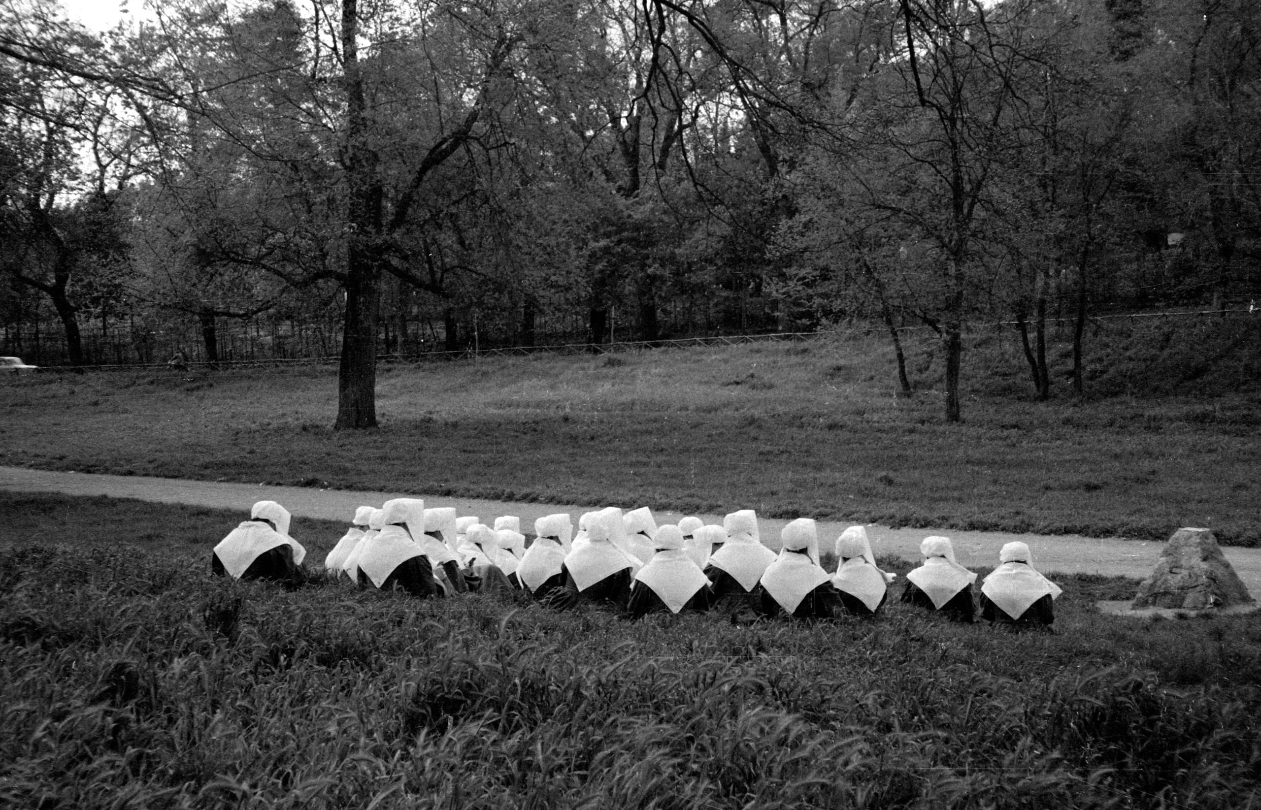 Black and white photograph of a large group of figures in dark habits and white rectangular head coverings, seen from behind, clustered in low vegetation beside a park path