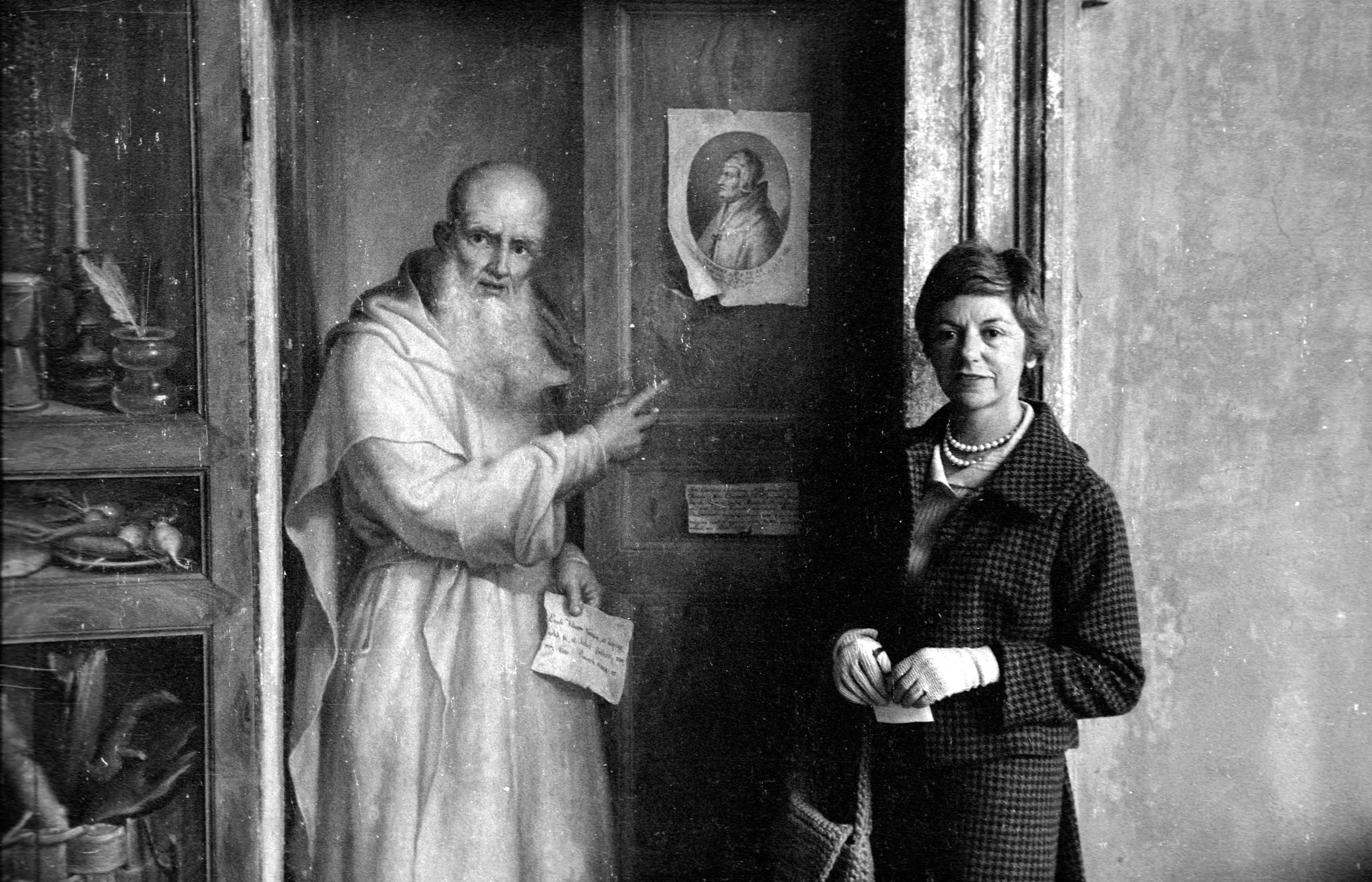 Black and white photograph of a woman in a houndstooth jacket standing beside a large old master painting of a robed, bearded monk pointing toward her