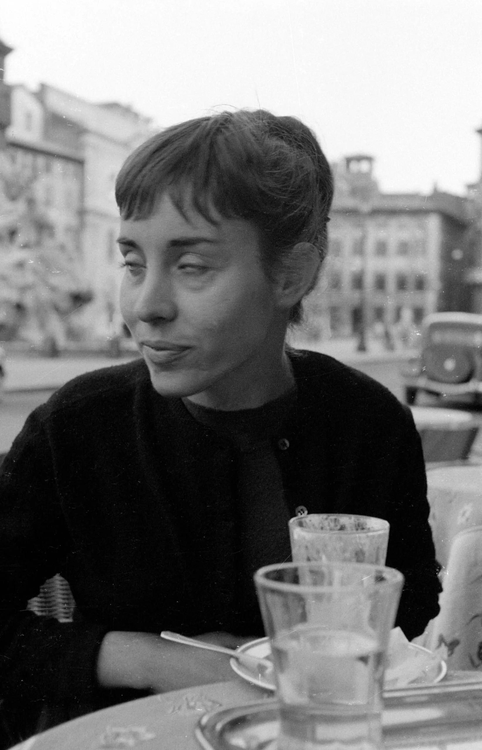 Black and white photograph, woman with short dark hair and bangs seated at an outdoor café table, European city square visible behind her