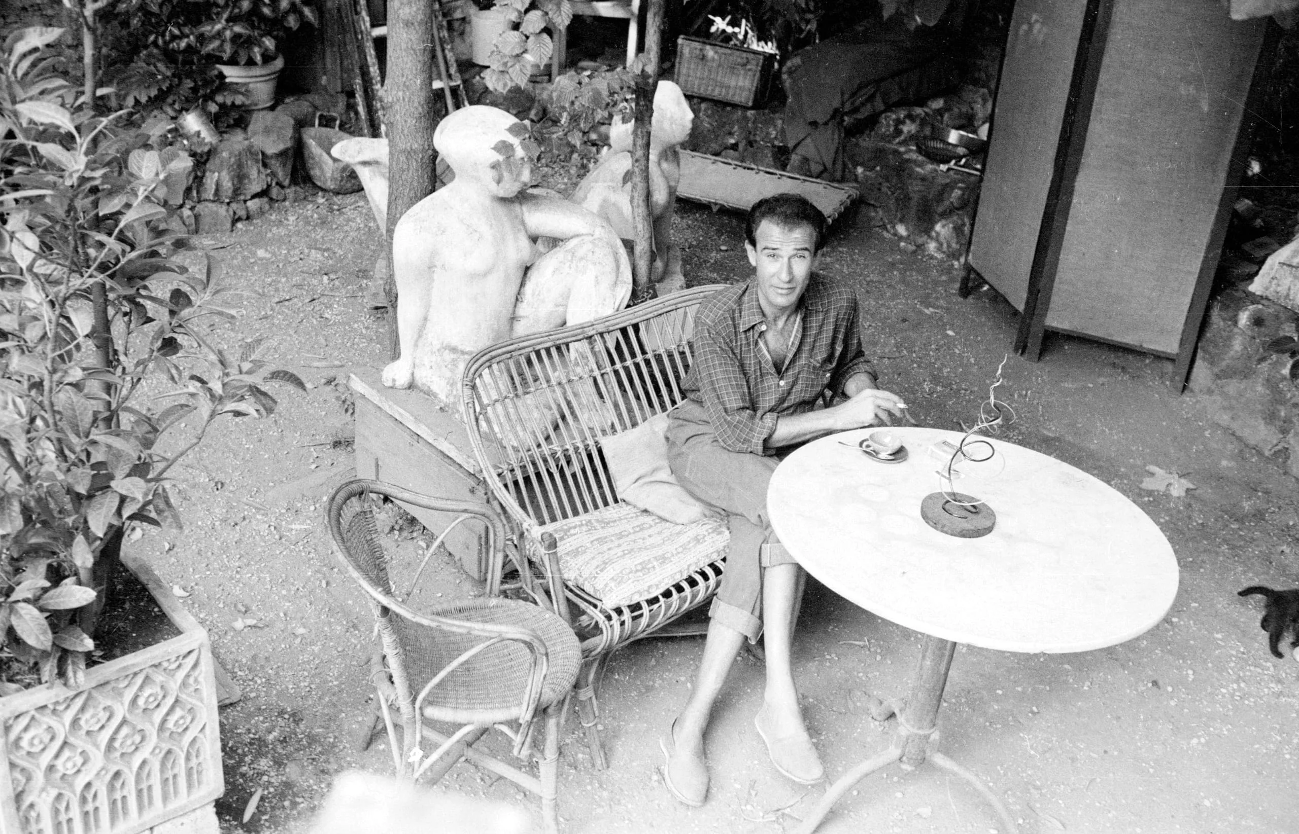 Black and white photograph of a man in plaid shirt and shorts seated in a wicker chair outdoors beside a round pedestal table, with a pale stone sculpture behind him