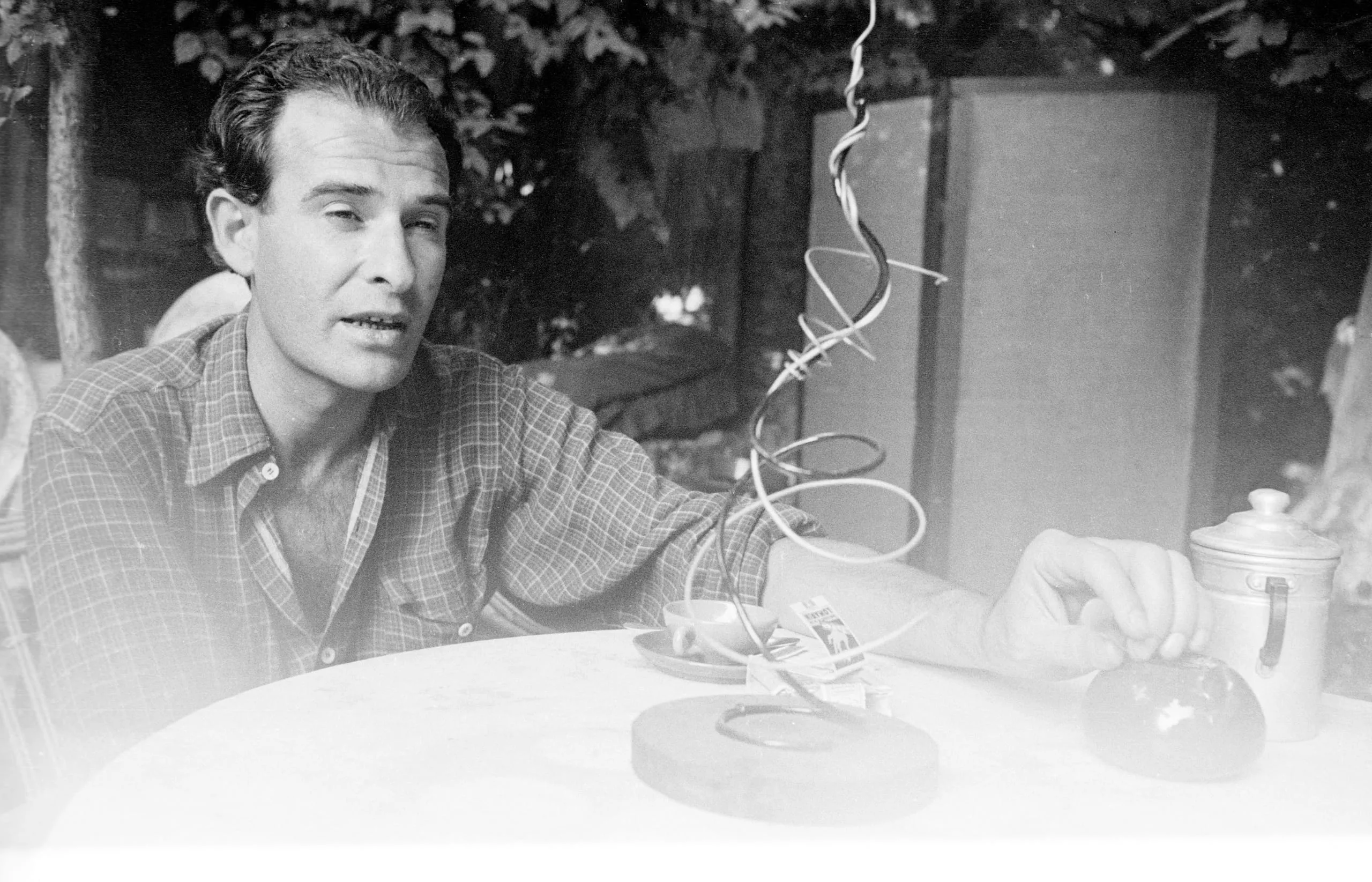 Black and white photograph of a man in a plaid shirt seated at an outdoor table, looking to the side, with a wire sculpture on the table before him