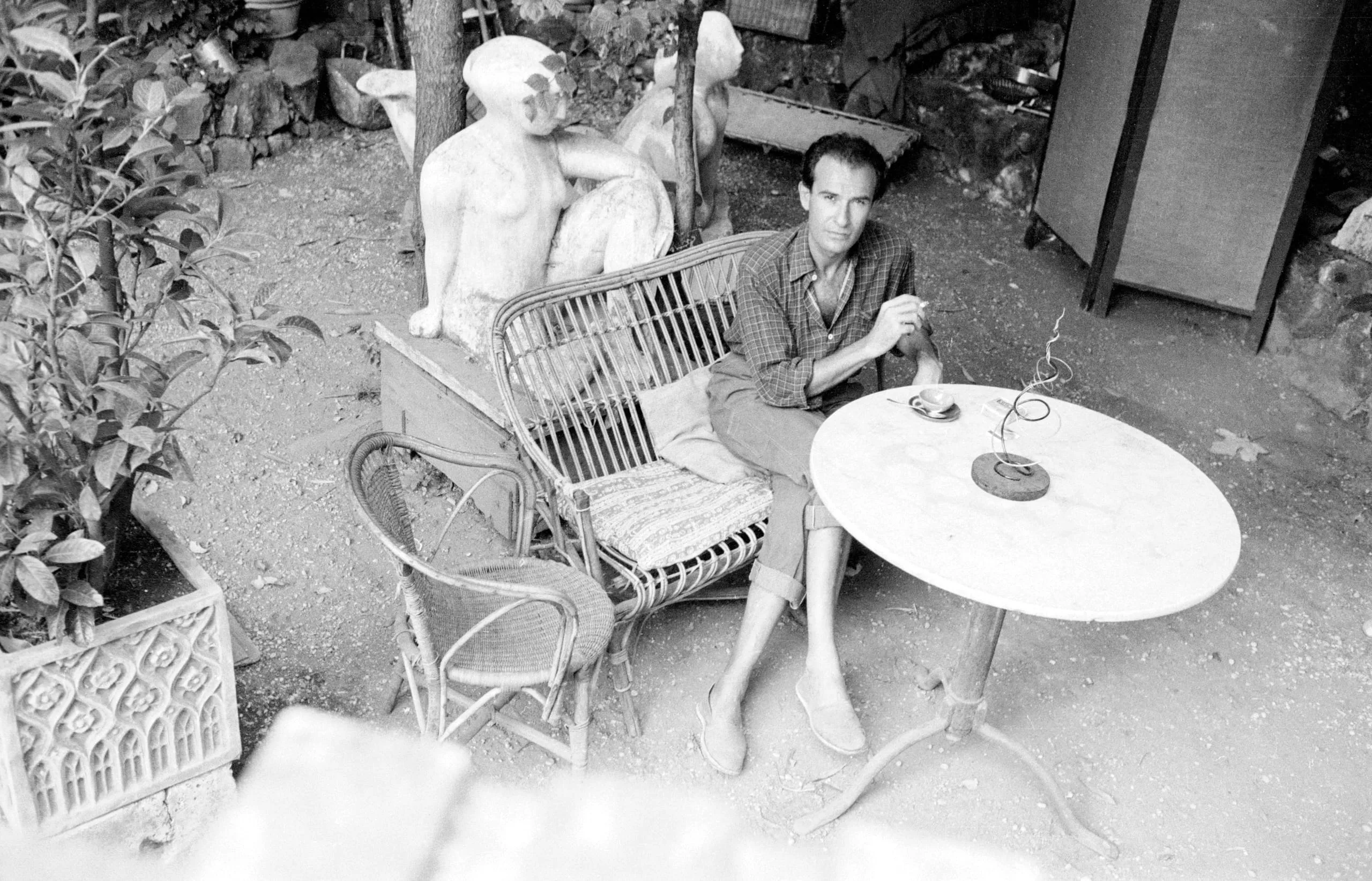 Black and white photograph of a man with short dark hair seated in a wicker chair outdoors, holding a cigarette, with a bistro table and stone sculpture nearby