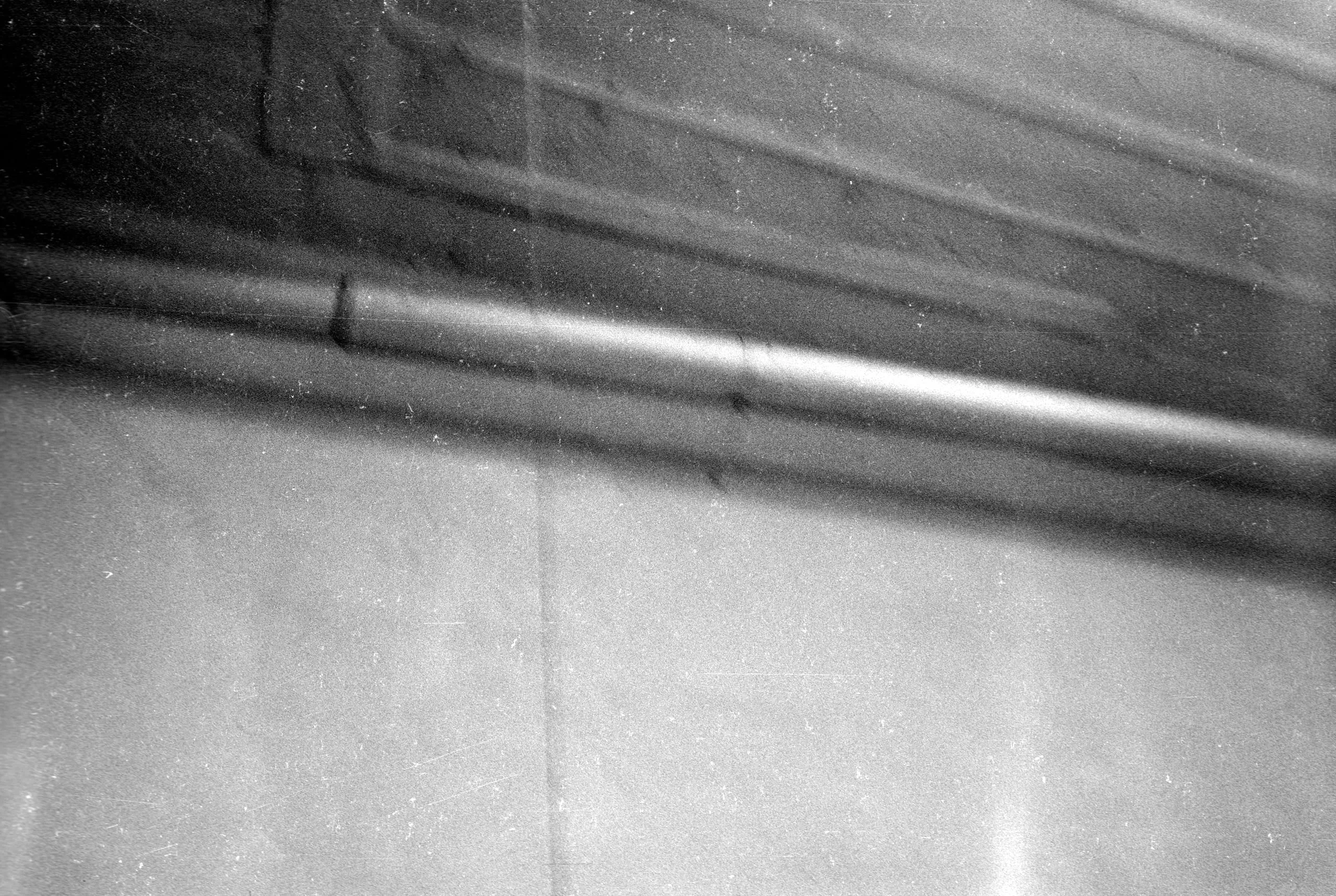 Black and white photograph of a cylindrical metal rod or pipe running diagonally across the frame, with a striated dark surface above and pale, creased surface below