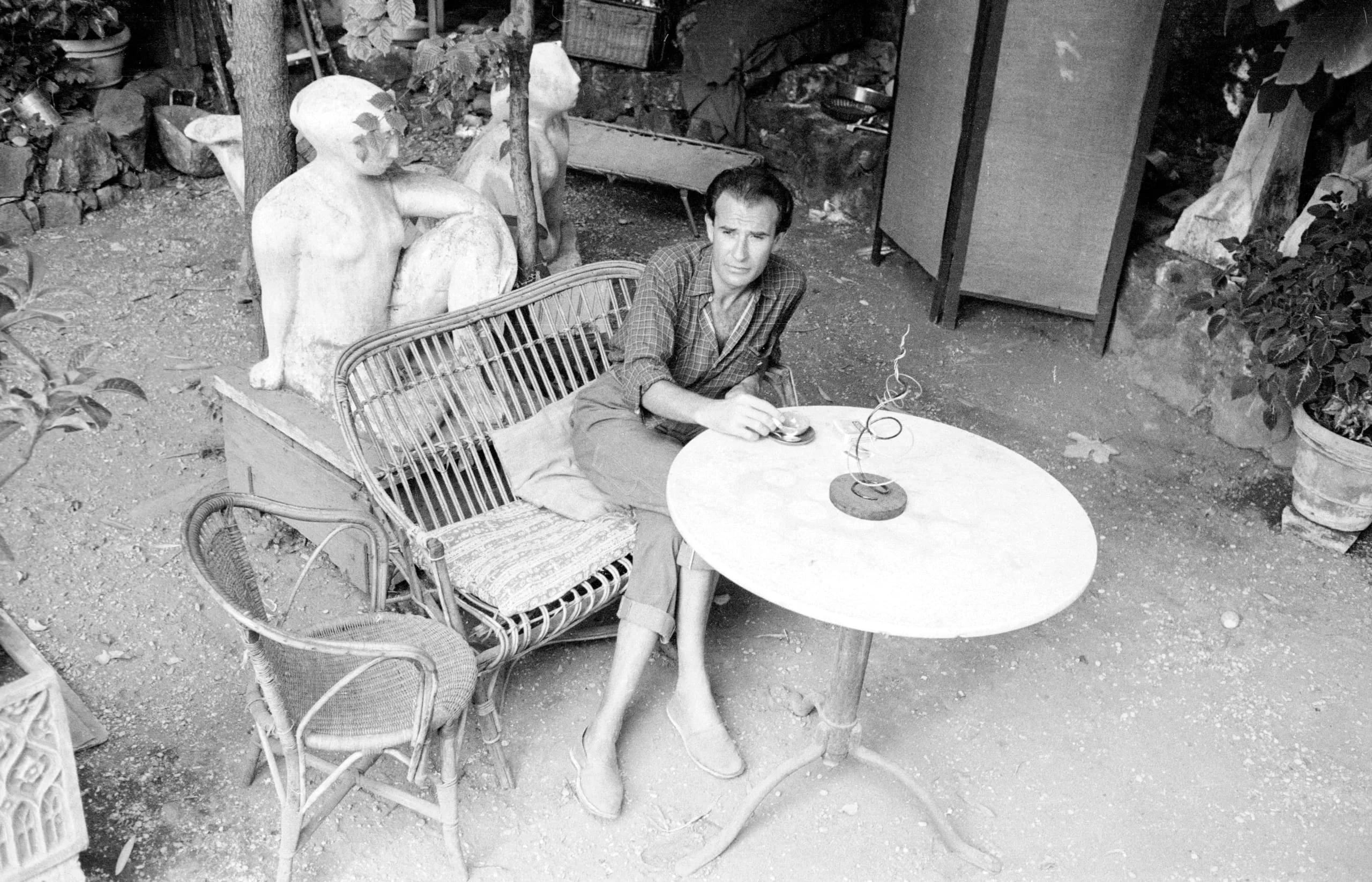 Black and white photograph of a man seated in a wicker chair outdoors among plaster sculptures, a round table to his right